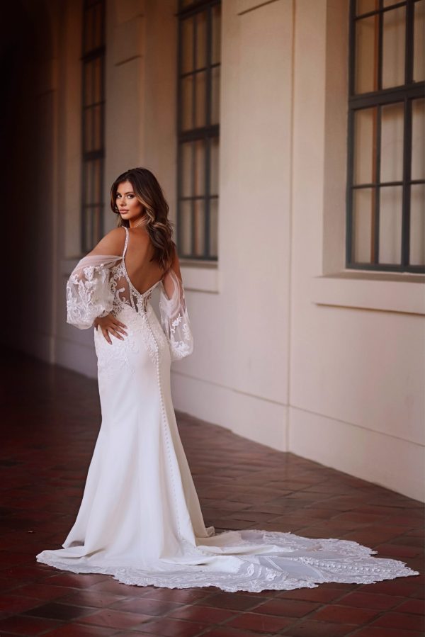 Lovely, ladylike and luxurious. Style 1406 from Martina Liana is a sexy take on a modern bridal silhouette. A plunging V-neckline, beaded spaghetti straps and a sheer bodice with exposed boning and lace details elongate the figure and offer an impeccable fit. The off-the-shoulder puff sleeves with beaded cuffs add a touch of fashion-forward appeal. The sequins on the back of the dress add a soft sparkle, while the delicate buttons, crepe skirt and scalloped lace train add a hint of vintage romance to this glamorous couture wedding gown