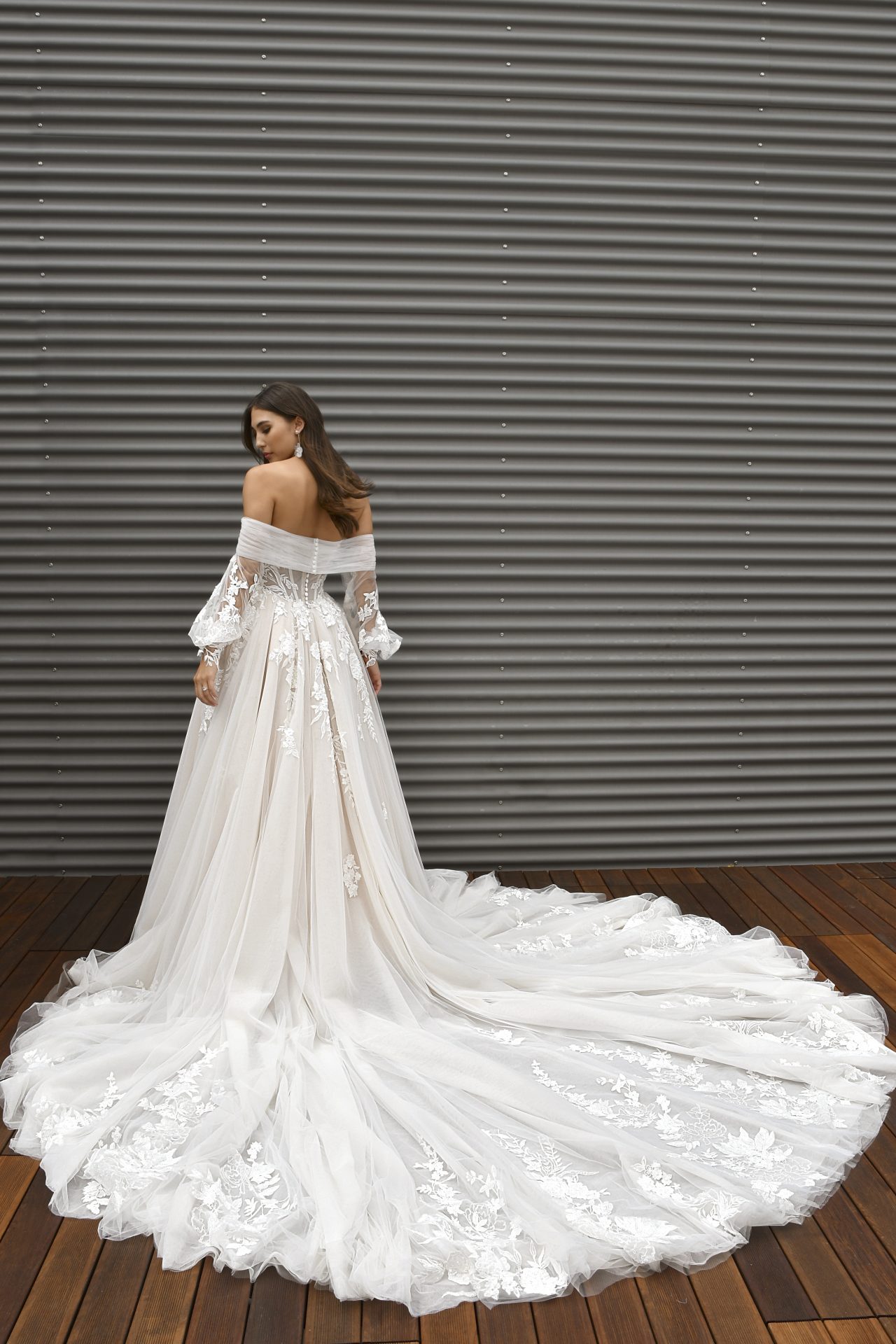 Enchanting. Elegant. Ethereal. Style 1413 from Martina Liana is the epitome of modern romance. The contoured bustline, intricate boning, fashion-forward puff sleeves and glamorous wrap detail highlight the upper body of the couture wedding dress. The sheer bodice features delicate beadwork with soft shimmer and rich embroidery for added texture and dimension. Floral lace motifs give the dress ultra-feminine appeal, while the extended train adds an eye-catching element to the back of the breathtakingly beautiful gown.