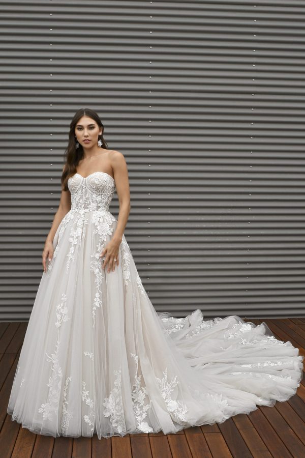 We carry select styles from each designer, and dresses often sell off the floor so availability changes regularly from what’s online.