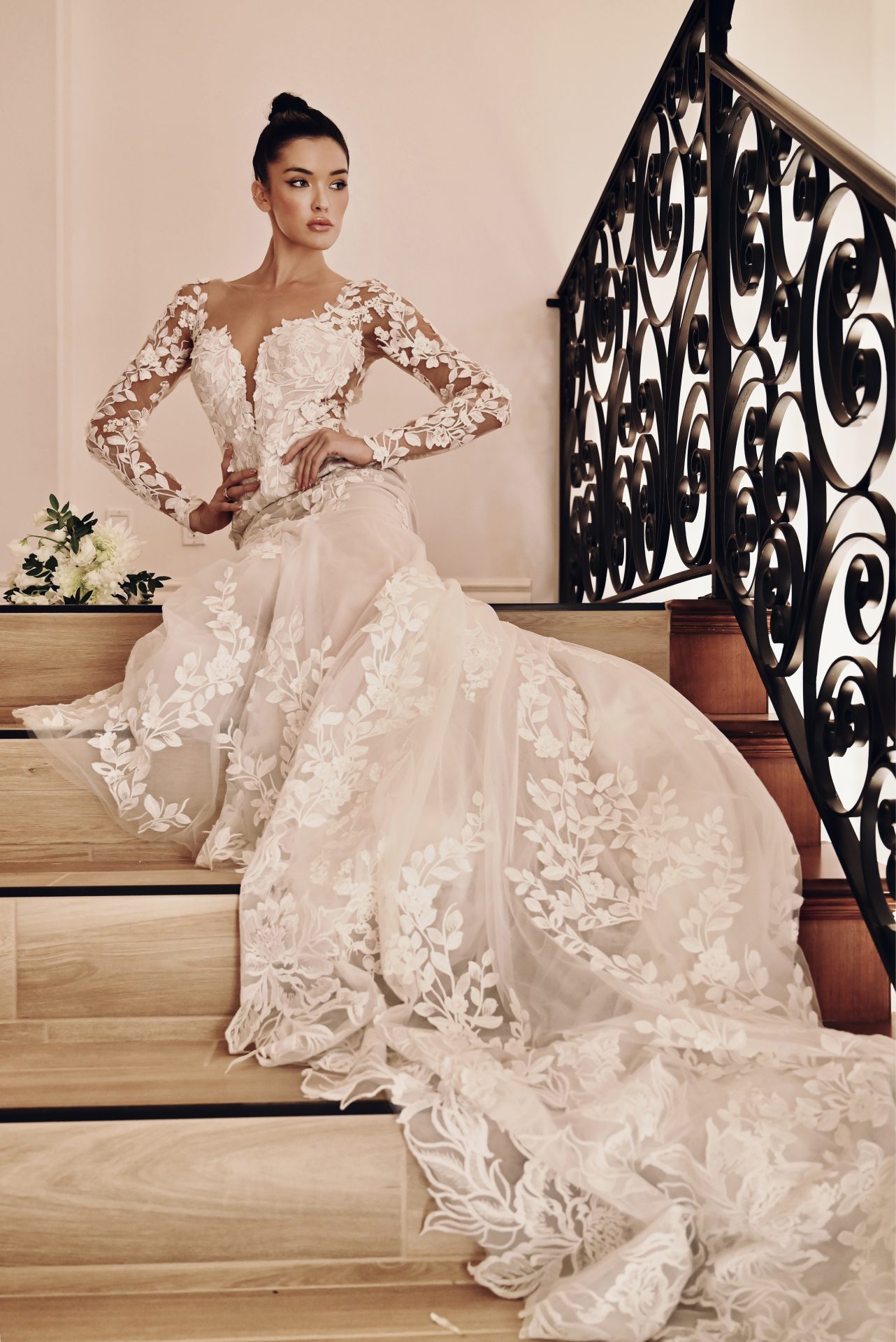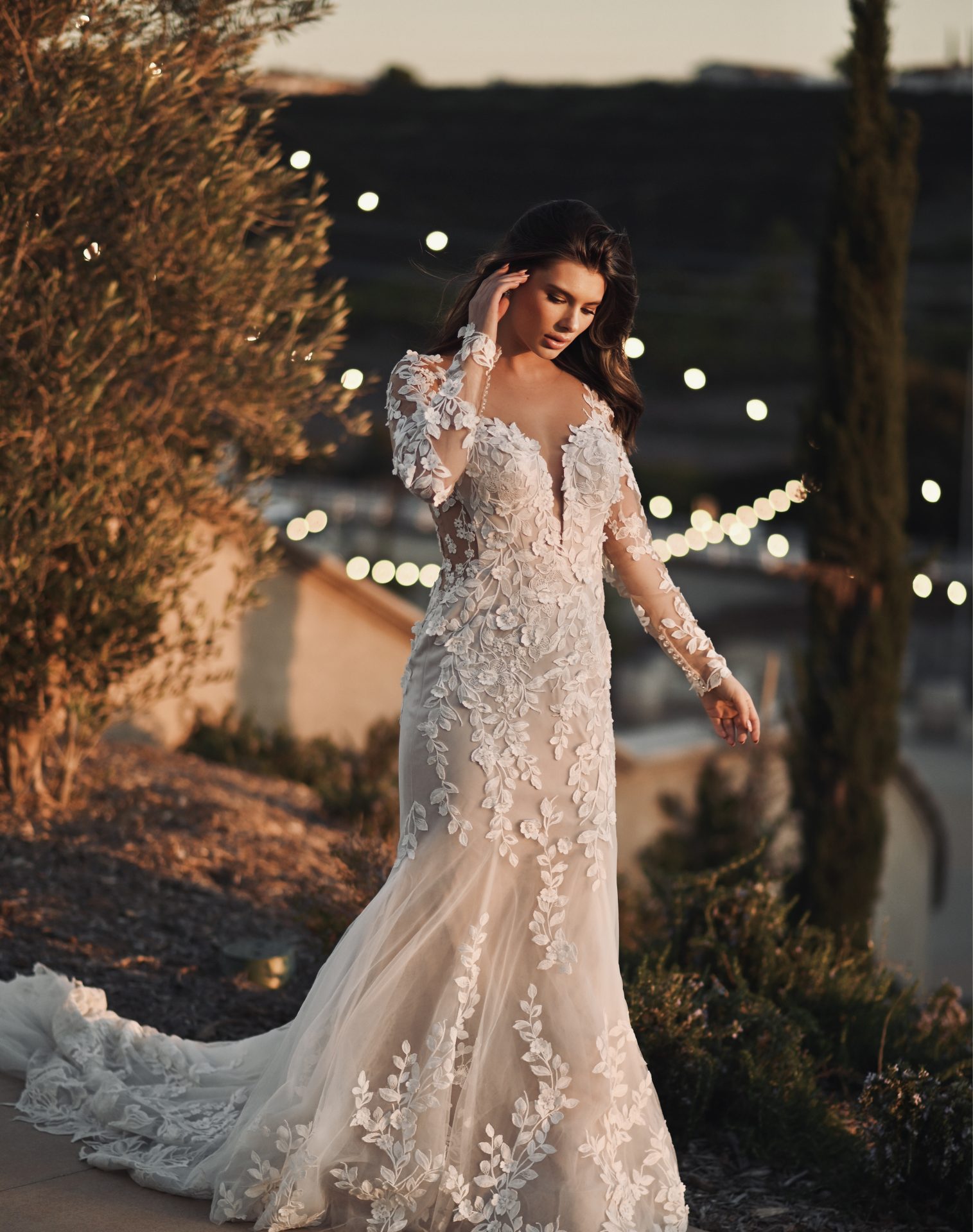 An exquisite bridal vision comes to life in Style 1440. This breathtakingly beautiful wedding dress features a stunning sleeveless option or delicate optional lace long sleeves, which add a timeless appeal, before meeting a modern plunging neckline with an organic lace finish. The striking matte floral lace creates a stunning illusion back detail and is hand-placed throughout the fitted column sheath silhouette for an allover lace look. The impeccable design flares into a gauzy trumpet skirt past the hips and finally into a long ethereal lace train to complete this magnificent romantic vision.