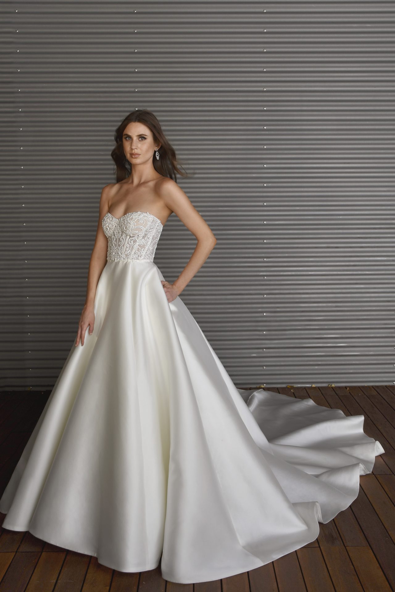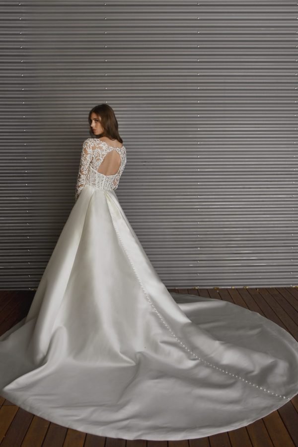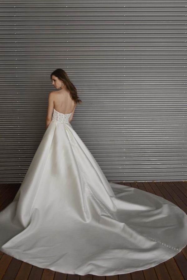 It’s a couture wedding dress fit for a modern princess. Style 1441 from Martina Liana radiates romance, elegance and luxury. The sweetheart neckline and beaded bustier corset top with exposed boning create an incredibly flattering and feminine fit. The detachable illusion tulle jacket showcases the swirling lace detailing of the wedding gown, while the sheer keyhole back and exposed boning highlight the sleek silhouette of this beautiful design. The simple yet stylish crepe skirt makes an eye-catching statement with its show-stopping voluminous shape and intricate fabric buttons. It’s bridal beauty from head to toe.