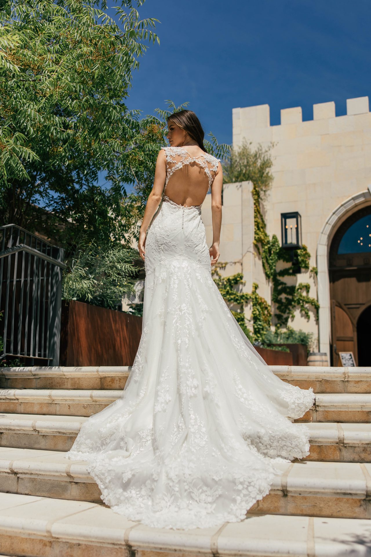 In a look of classic bridal beauty, Style 1463 radiates Old World elegance with modern sophistication in this allover lace fit-and-flare wedding gown. Lace cap sleeves add a softness to the shoulder before dipping into a plunging sweetheart neckline in the front and forming a round keyhole open back detail. Highlighting the figure throughout the hip, the allover vine lace cascades into the flared skirt and sweeping train with a glamorous undersparkle and detachable overskirt to add another layer of ethereal beauty to this timeless wedding dress.