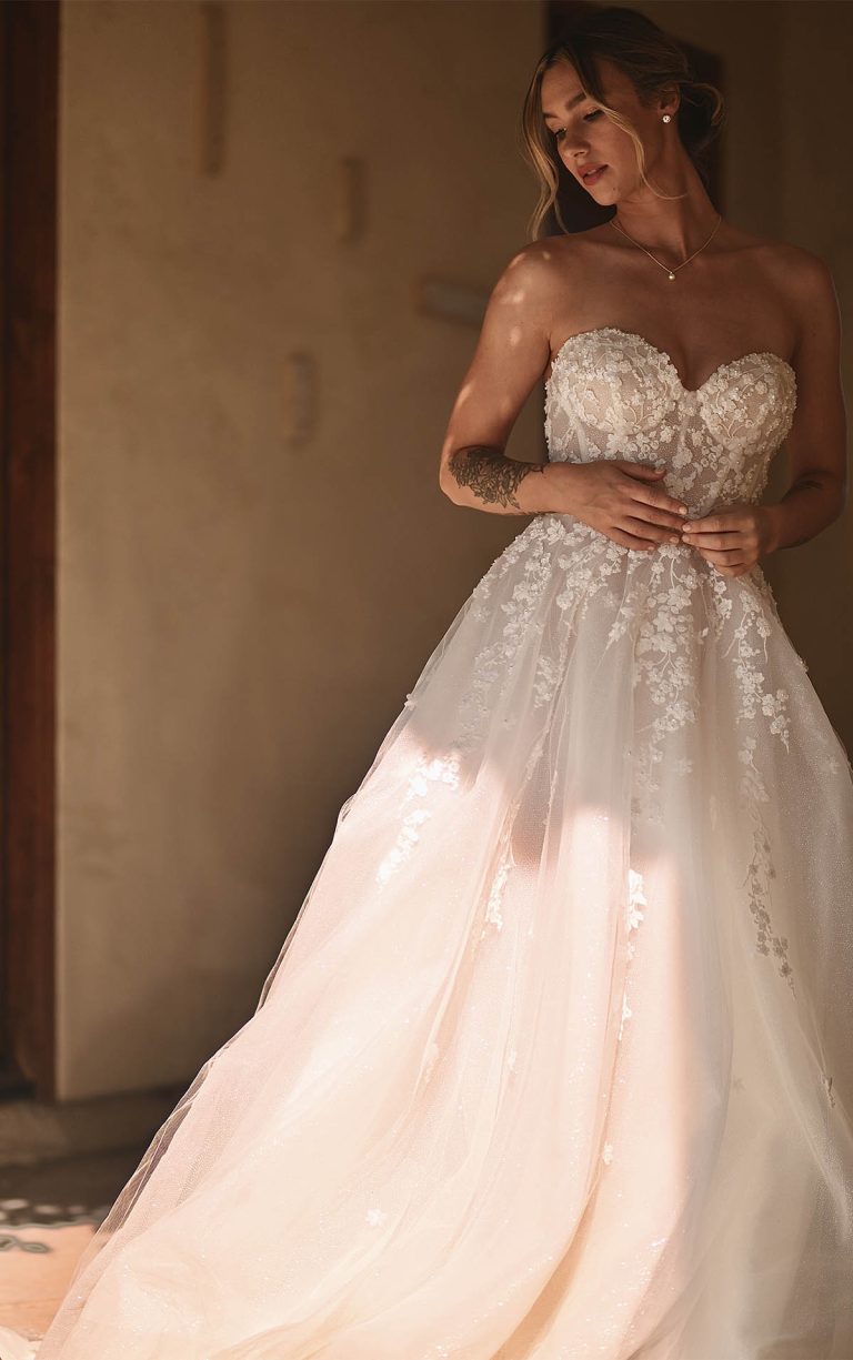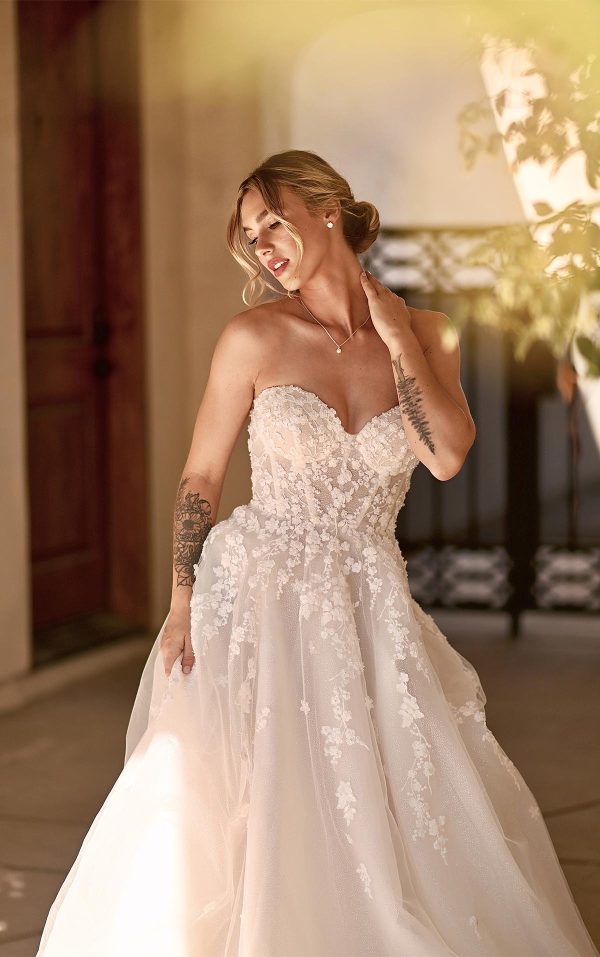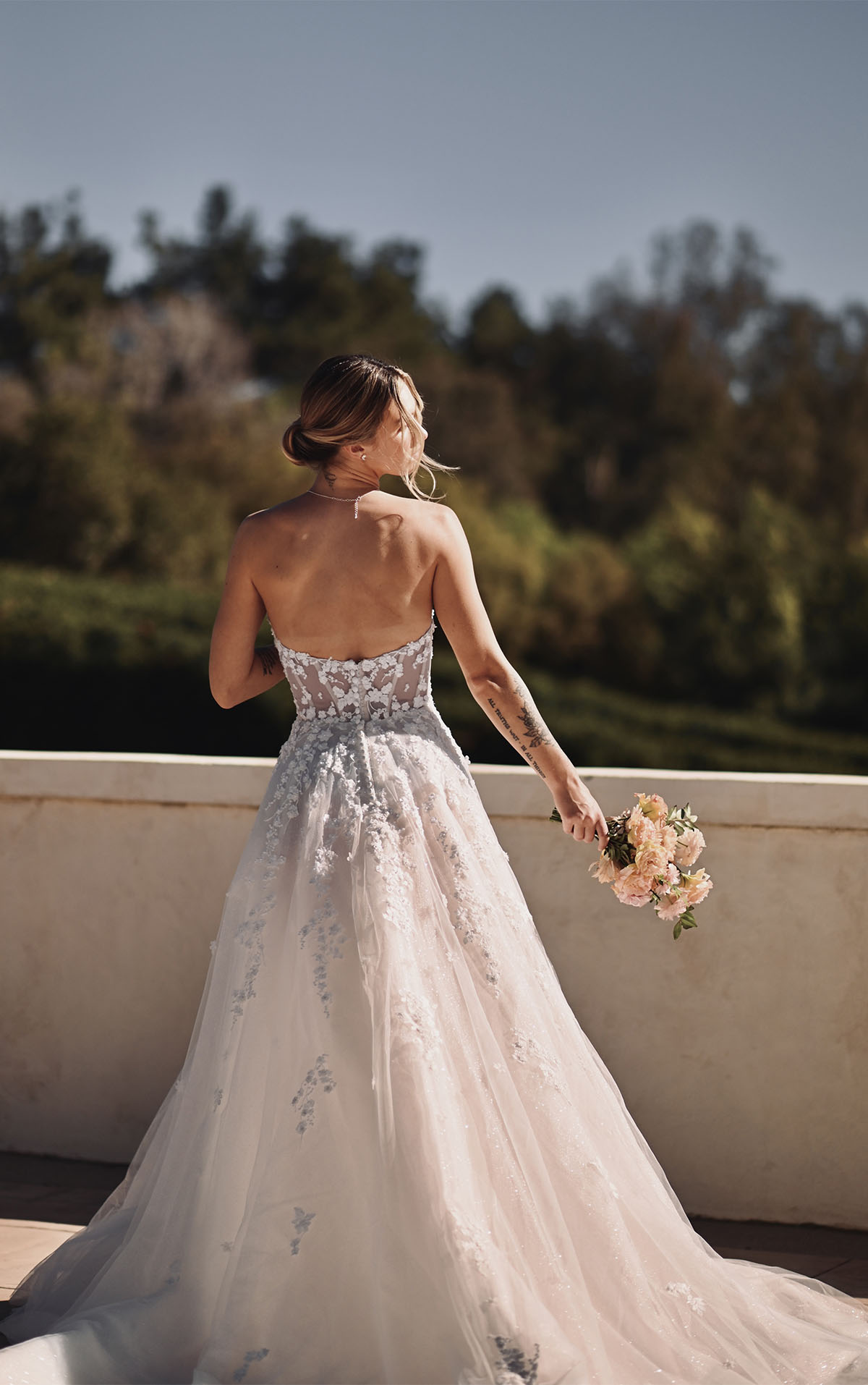 Romance and luxury meet in this glittering A-line wedding dress with dainty lace detail. Style 1483 features a strapless corset-style bodice with a sculptured plunging neckline with elegant floral lace embellishment. In the back, the bodice turns transparent for a glamorous illusion back detail and a nod to heirloom vintage fashion with a row of fabric-covered buttons. From the semi-sheer bodice, the floral flourishes descend into a full glitter tulle skirt that effortlessly sways in its layered extravagance, reaching back into a chapel train with exquisite floral lace appliques at the hem.