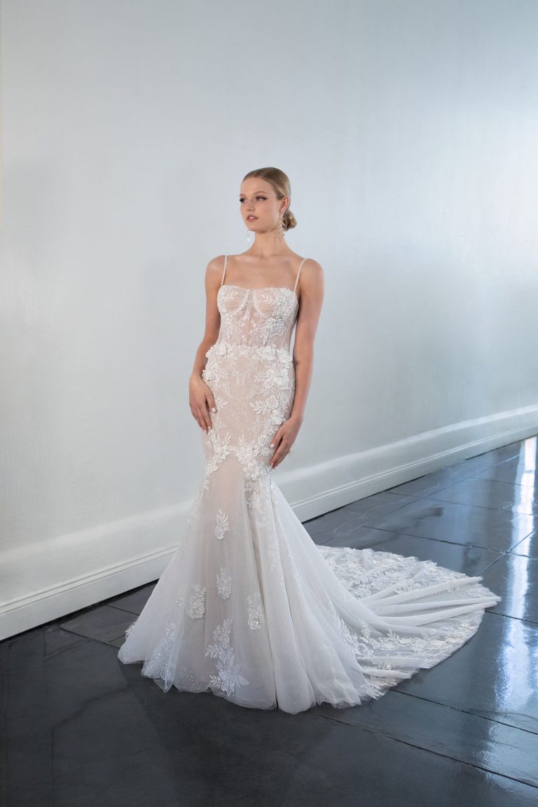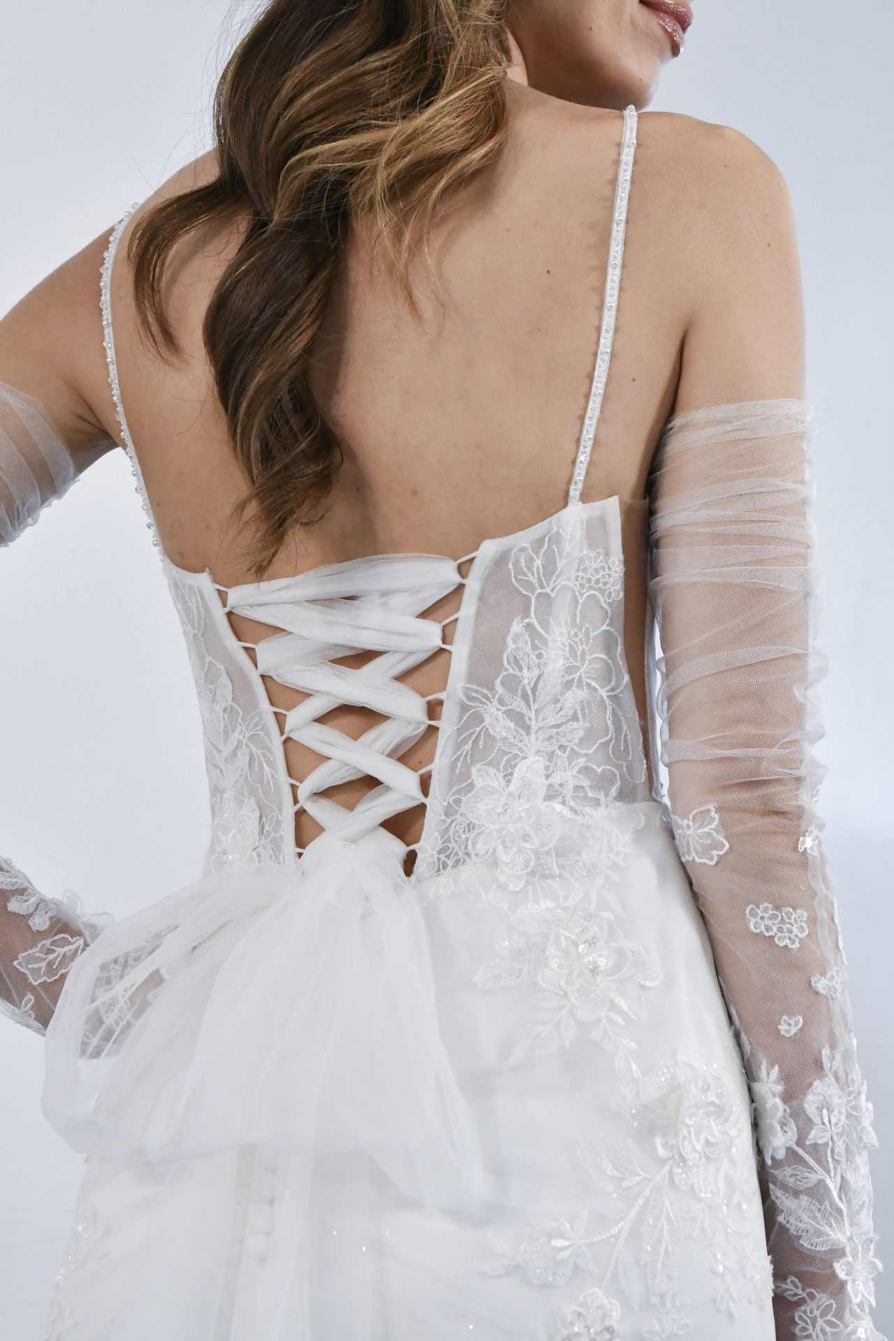 Classic bridal details are transformed in this alluring fit-and-flare wedding dress. Style 1488 starts with beaded spaghetti straps to meet a sparkling sheer bustier bodice. The straight-across neckline and exposed corset boning highlight the figure and shape with its architectural lines while seamlessly meeting the sexy side cutouts of illusion tulle. A twist on the traditional laced back detail is created by soft airy tulle straps and embroidered lace details and matching sheer long lace gloves (sold separately). To further accentuate the figure-flattering fit-and-flare silhouette, beaded floral lace appliqué adorn the frothy layered skirt and sparkling tulle underneath adds shimmering dimension and detail to complete this stunning bridal look.