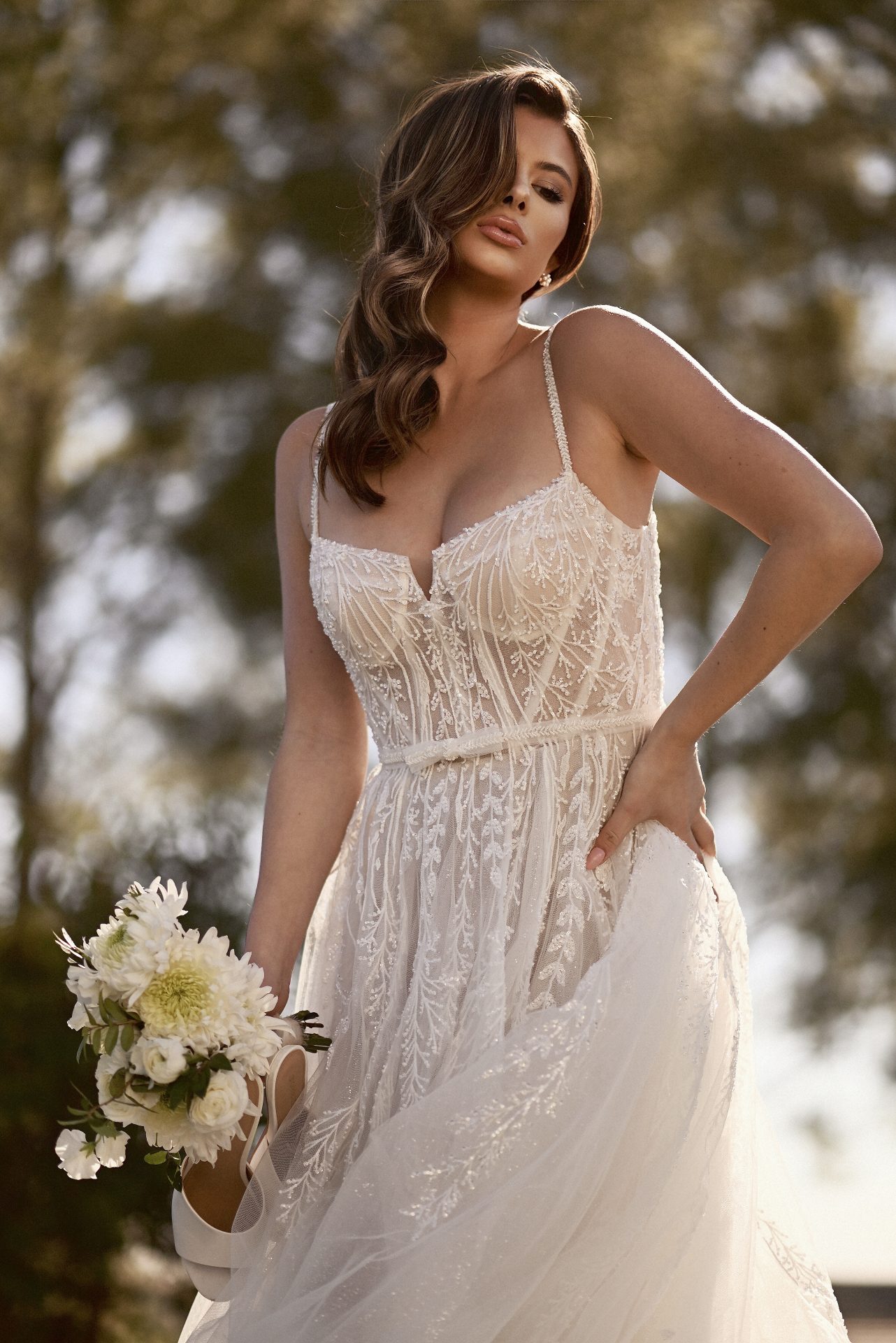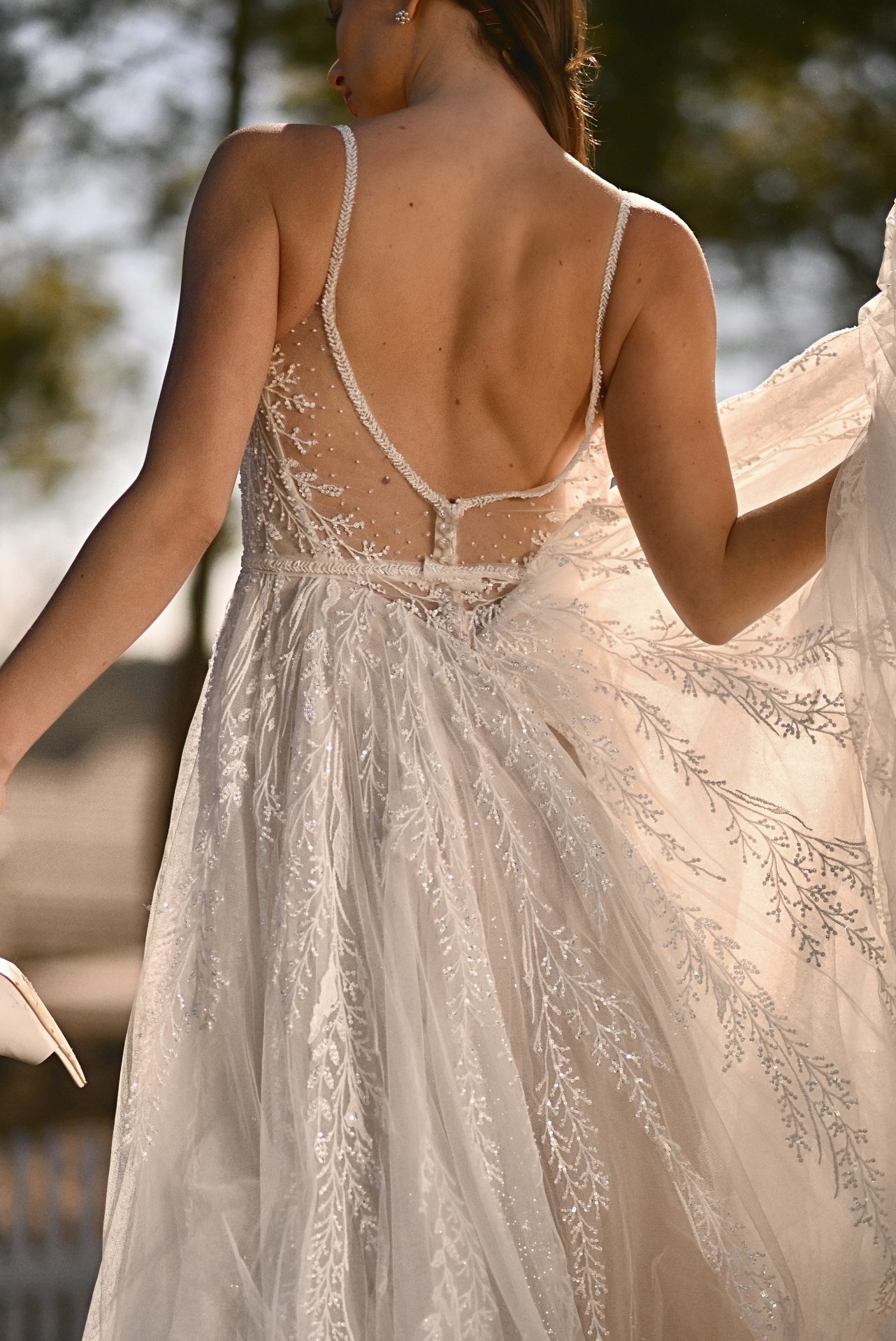 An ethereal couture masterpiece, Style 1490 offers sleek chevron beaded spaghetti straps that attach to an alluring balconette bodice of exquisite beaded embellishment. The romantic bodice flows into an illusion back detail, adorned with delicate sparkle accents that cascade into the frothy skirt of glitter tulle sweeping train that effortlessly floats with every movement. For a final modern detail to this dreamlike dress, a side slit hidden within the soft draped skirt layers adds a touch of drama to the modern fashion-forward look.