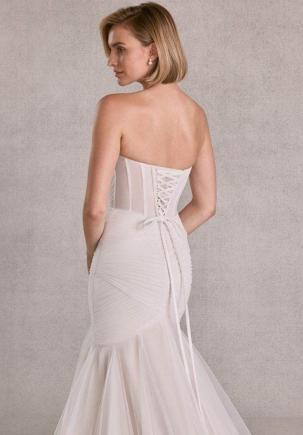 Sexy mermaid wedding dress has a strapless scoop neckline on a sheer, basque waist boned bodice with asymmetric ruched, a lace-up corset back with detachable off-the-shoulder.