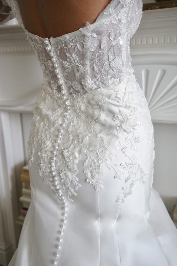 Romantic, sexy and oh-so-glamorous, Style 1679 radiates classic bridal beauty from its 3D floral-adorned lace bodice to its luxe silk fit-and-flare skirt. From detachable off-the-shoulder straps, a flattering floral lace sweetheart neckline is embellished with delicate 3D florals and exquisite beadwork. In the back, pearlescent beads line the full-length of this glamorous wedding gown, forming a natural transition from the floral lace of the fitted bodice and hip and the clean and chic silk skirt and train. Flaring past the hips, the fit-and-flare silhouette takes full shape, concluding in royal shaped train outlined in delicate lace. This stunning wedding gown is also available in plus sizes.
