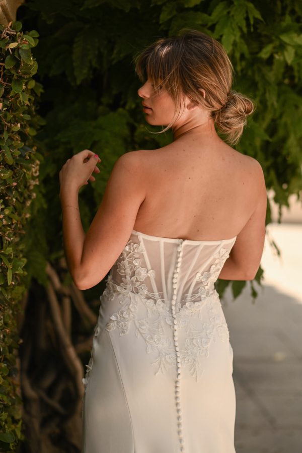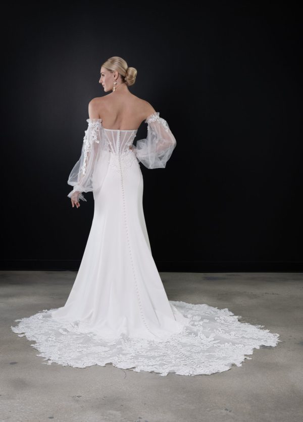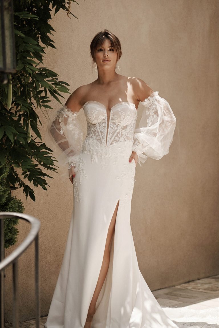 Embody romance and glamour in this show-stopping fit-and-flare wedding dress. A strapless sweetheart bustier bodice exposes the sexy corset boning underneath sheer tulle and hand-placed lace appliques as pleated tulle traces the sweetheart plunge at the neckline. Detachable off-the-shoulder blouson sleeves feature delicate lace cuffs and vintage-inspired fabric-covered buttons that trail from the wrist for a versatile and timeless accessory. Lace accents frame the figure through the fitted hips as an optional thigh-high leg slit adds a modern edge before meeting a breathtaking cutout lace train.“““`