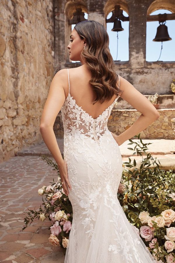 Say hello to stunning Style 2467 Annalise, the perfect blend of sensual romance and sophisticated femininity. The lace patterns on this gown are deeply dimensional, with Chantilly lace providing a beautiful backdrop for the floral lace appliques, placed to accent the natural shape of the body. Spaghetti straps hold up a slightly plunging V-neckline that’s matched by a sexy V-back, while stretch Georgette sits underneath to ensure movability. Get ready to wow your spouse-to-be with the accessories on this gown that give options for four looks in one. Annalise’s cape option is flowy and soft, while the detachable puffed sleeve option provides a unique modern feel. With different veil styles, you can effortlessly switch from a simply stunning fingertip length to a show-stopping royal cathedral length veil.