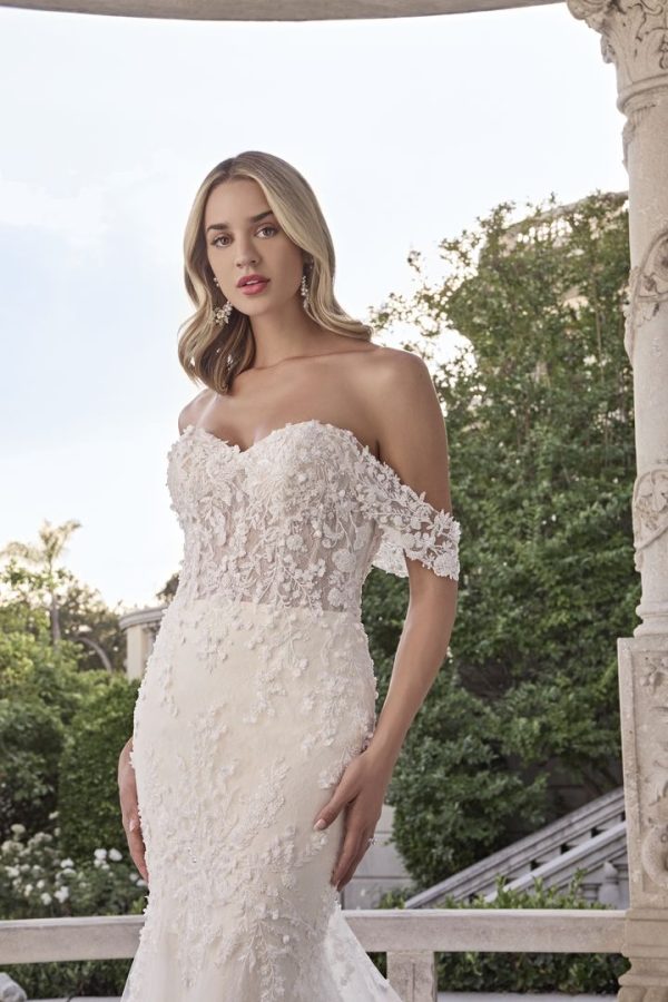 Style 2507 Kitty is a treasure to behold. Turn heads (and win hearts) in this stunning fit and flare gown in a wonderfully soft stretch georgette with Chantilly lace and intricate beading through ought. The sweetheart neckline and detachable off-the-shoulder sleeves breathe refreshed romance into this elegant ensemble, which boasts an impressive 94″ train perfect for making a grand entrance. A matching veil 2507V is the ideal accompaniment to this classic bridal look.