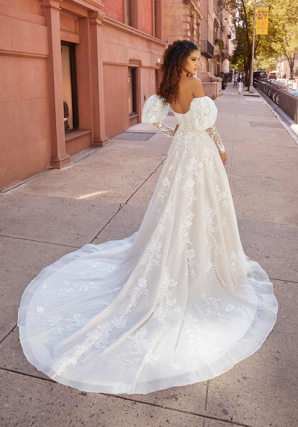 Classic ball gown has a sweetheart neckline, drop waist, and detachable long pouf sleeve designed with elegant crystal beaded embroidered lace.