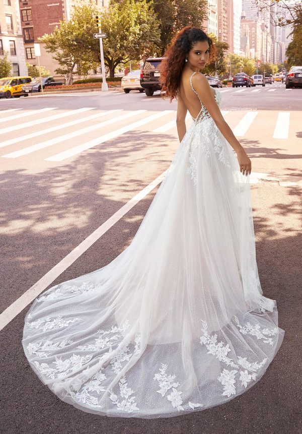 Elegant A-line has romantic frosted embroidered lace on a plunging bodice with crystal beading trim and a sparkling glitter tulle skirt.