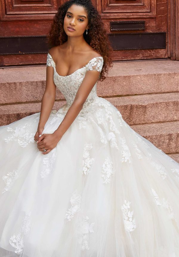Classic ball gown has an off-the-shoulder corset bodice with feminine frosted floral embroidery floating down the cloud-like skirt.