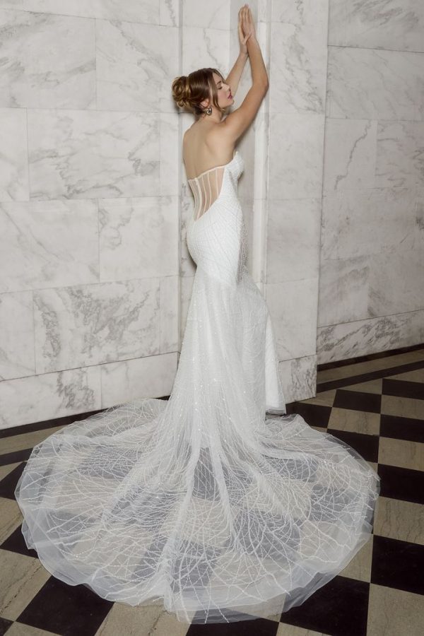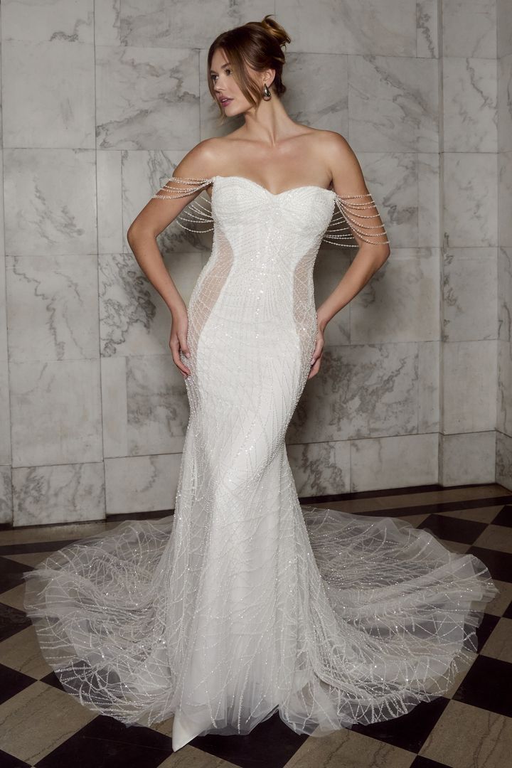 Sterling is a captivating embodiment of bridal glamour. Crafted from luxurious stretch chiffon and tulle, this fit-and-flare gown is designed to accentuate every curve. Casablanca Bridal’s signature beading and embroidered lace decorate the entirety of the gown leaving it sparkling from the pointed sweetheart neckline all the way down to the 77-inch train. Her off-shoulder beaded straps are a testimony of stardom and one of her most notable features are the unlined cut outs in the front of the gown creating a figure-flattering effect. The back of the dress is highlighted by stunning, exposed boning in the bodice leading your eyes down her fitted silhouette.