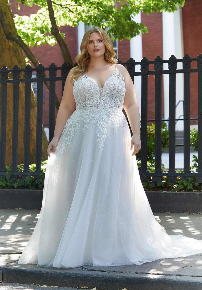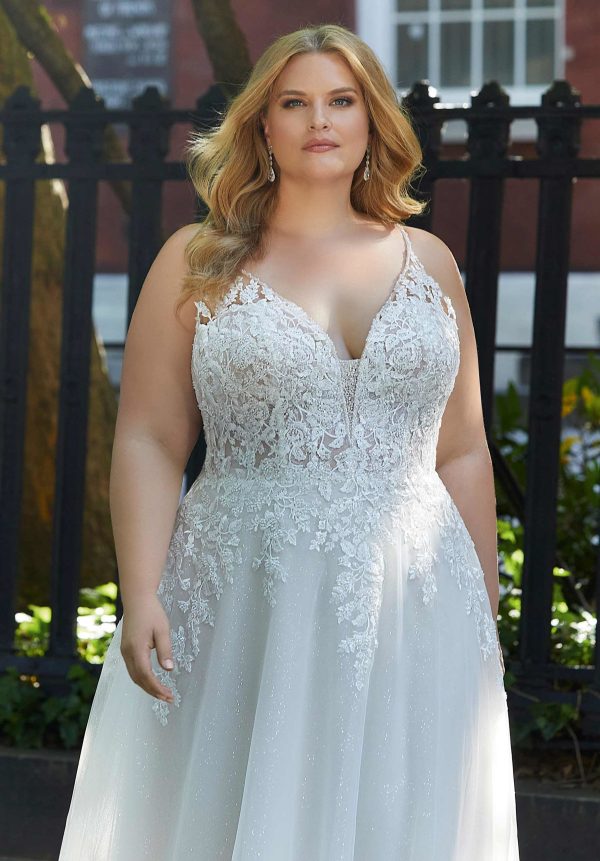 Dreamy A-line has a plunging bodice with delicate beaded embroidered over romantic Chantilly lace on glowing glitter tulle.