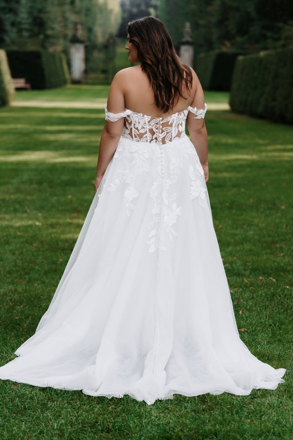 An oversized floral motif adorns the bodice and wide off-shoulder straps of this classic tulle gown.