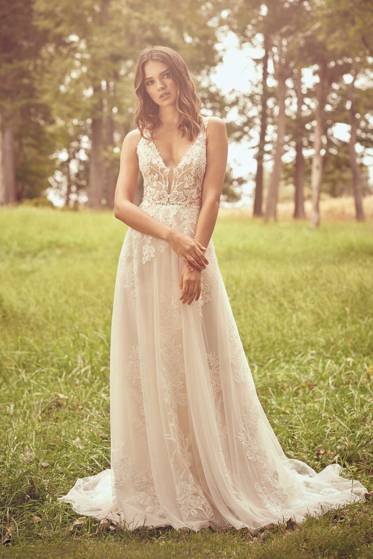 We carry select styles from each designer, and dresses often sell off the floor so availability changes regularly from what’s online.