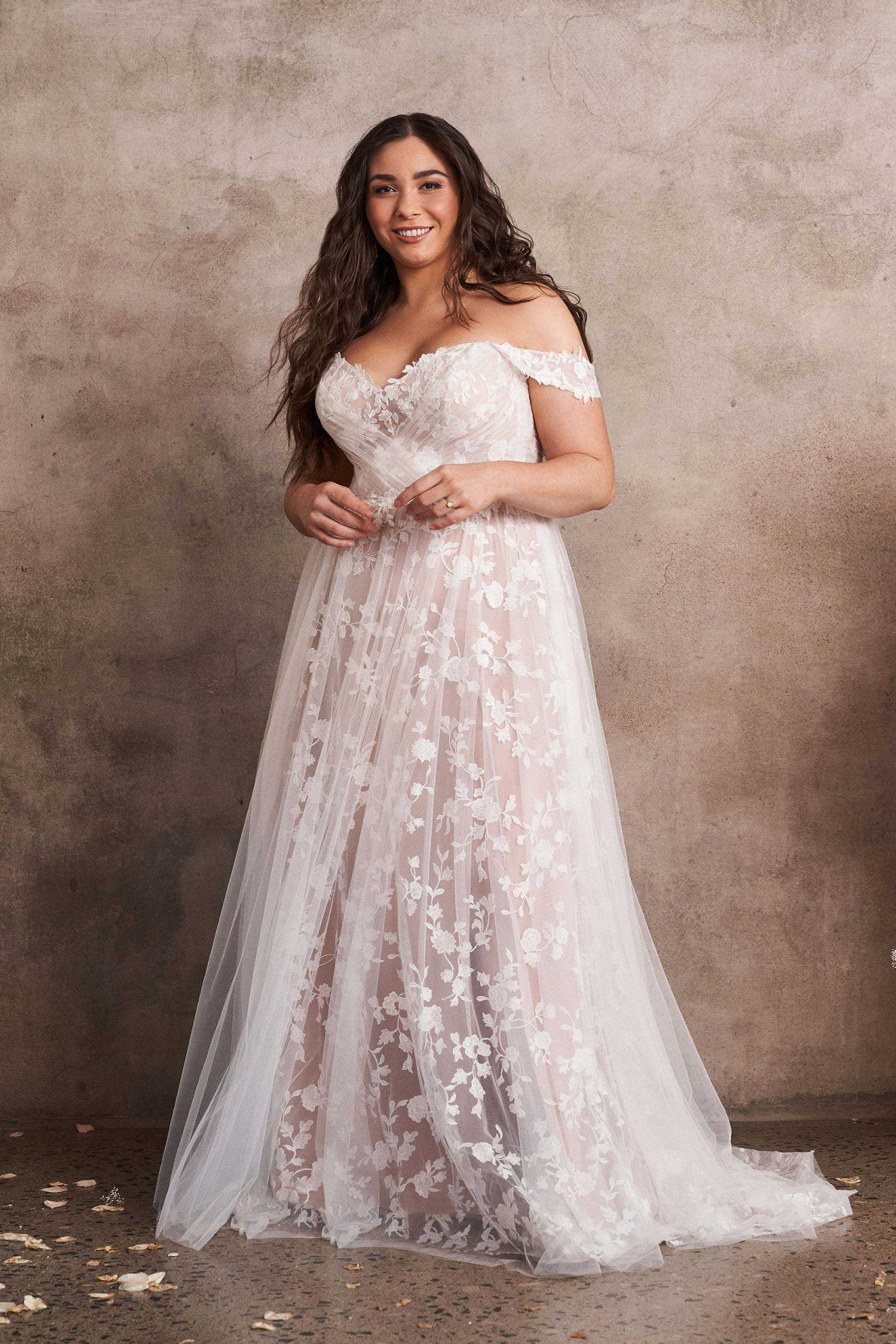 We carry select styles from each designer, and dresses often sell off the floor so availability changes regularly from what’s online.