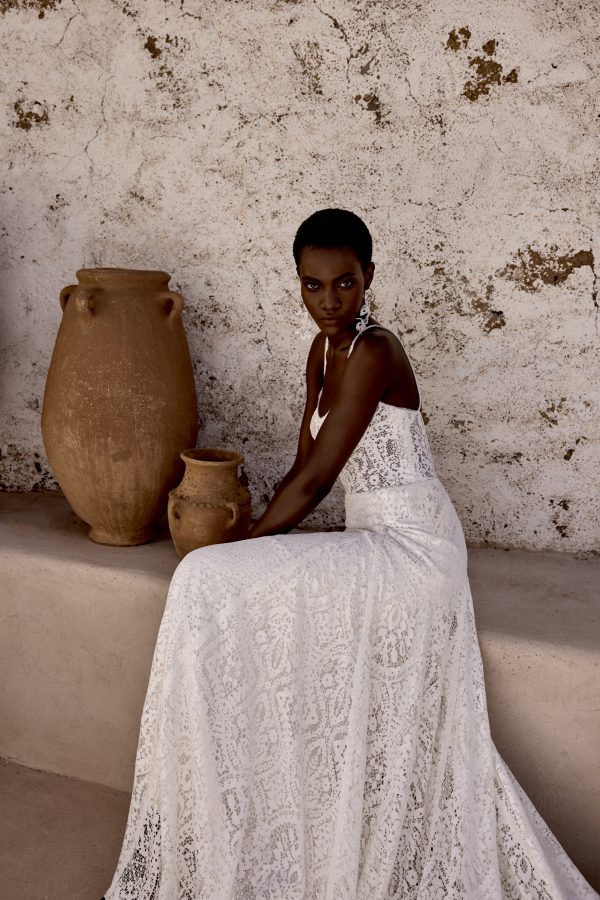 We carry select styles from each designer, and dresses often sell off the floor so availability changes regularly from what’s online.