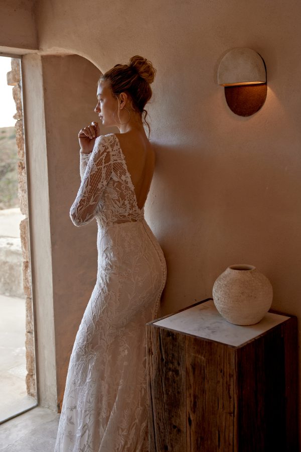 Allover Embroidered Lace Fit and Flare Gown with Long Sleeves