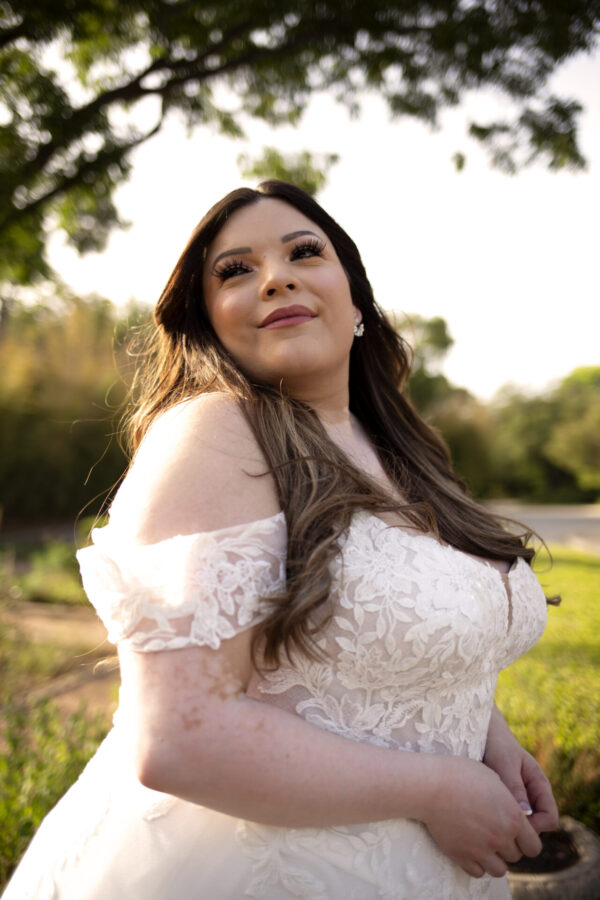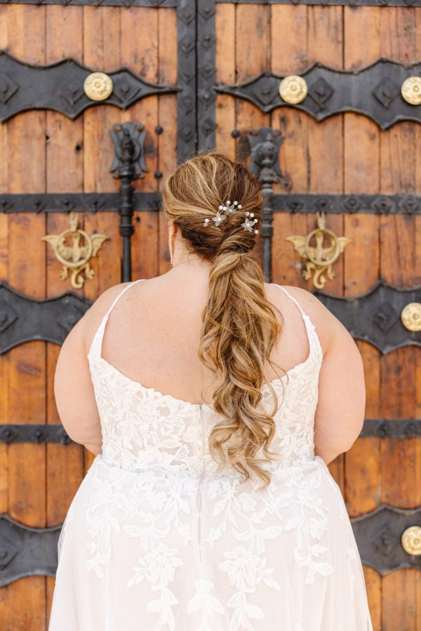 For the bride who adores timeless style with a twist, Style 7447 is the ultimate princess-inspired plus size wedding dress. An elegant soft A-line silhouette and subtle scoop neckline add a modern and sophisticated appeal to this fairytale gown. This enchanting design features beautifully beaded spaghetti straps with an option for detachable off-the-shoulder sleeves in a soft romantic lace. With a blend of floral and leaf motifs, sequined hand-placed lace appliques adorn the semi-sheer bodice and organically blend with the frothy tulle layers of the skirt, creating a graceful and elegant effect down the aisle.