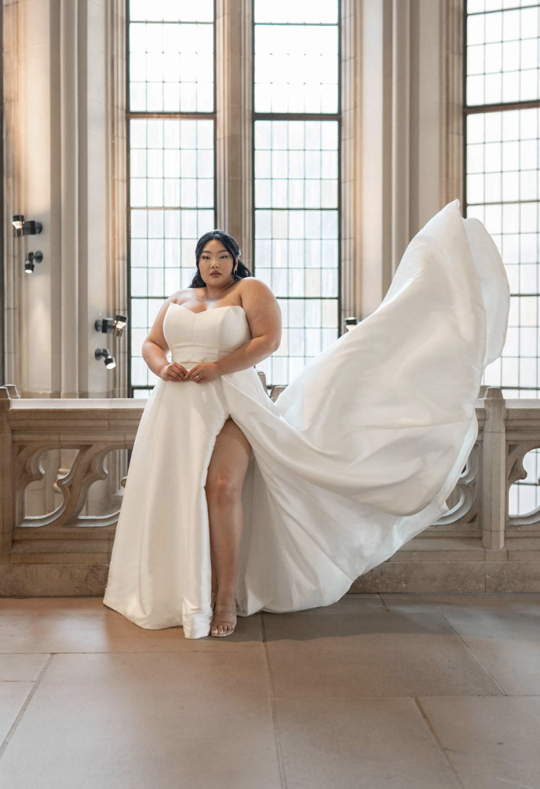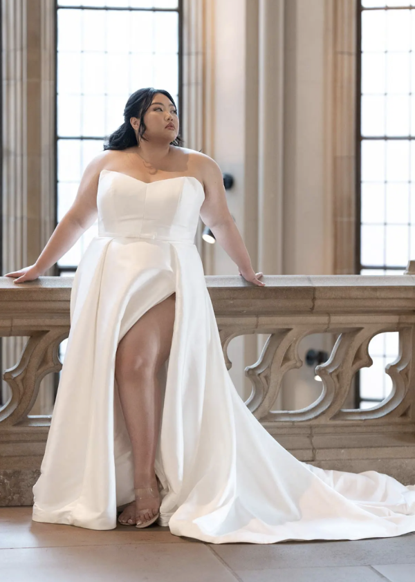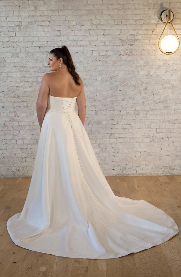 Modern minimalism meets classic luxury in this glamorous yet simple wedding dress. Luminous ivory Matte Mikado drapes the form of Style 7601 in a sleek A-line silhouette that starts with the strapless sweetheart neckline of the bodice. Tapered at the waist is a chic detachable bow detail for a touch of sophistication, as the button back detail adorns the length of the dress all the way to the edge of its full train for a contemporary update to traditional bridal fashion. This wedding gown is also available in plus sizes.