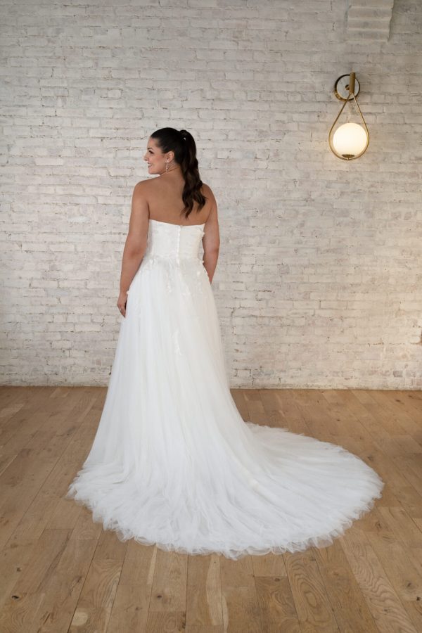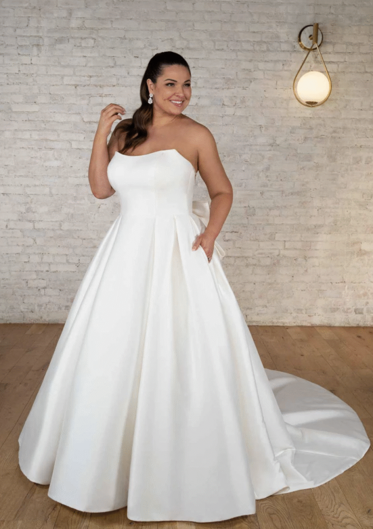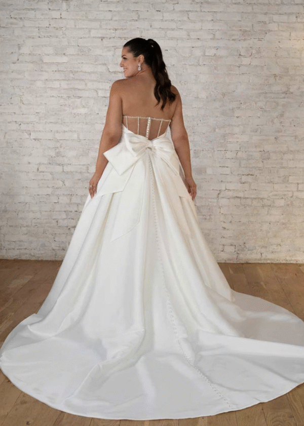 An elegant and classic ballgown is transformed into a contemporary runway-worthy plus size wedding dress in Style 7711, constructed in luxurious Mikado and featuring modern accessories like discreet hand pockets and a dramatic bow back detail. From a scooped strapless neckline, an impeccably-tailored bodice forms a clean and chic front bodice and a sheer and extravagant back with sparkling seam work and a detachable oversized bow accent. In extravagant and royal style, this modern ballgown is made complete with its full skirt and train.