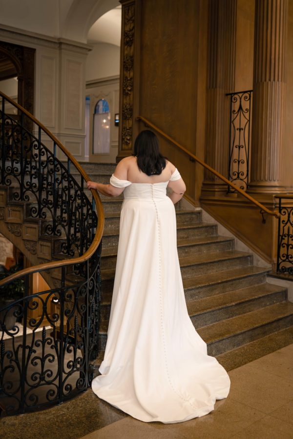 A sophisticated yet modern plus size wedding dress, Style 7749 wraps the figure in luxe satin that radiates pure goddess vibes. From a strapless sweetheart neckline bodice, detachable off-the-shoulder straps add a touch of romanticism to this chic gown. Impeccably tailored, the clean seams and minimalist aesthetic include discreet hand pockets, a row of fabric-covered buttons in the back, and a sexy skirt slit before finishing with an opulent long train.