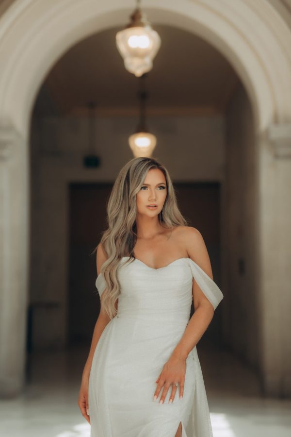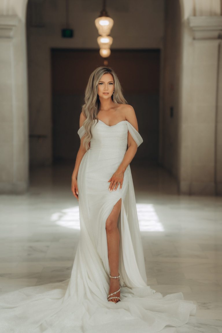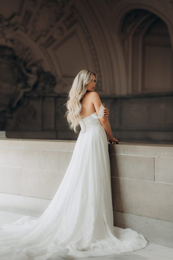 The shimmering tulle of Style 7815 radiates down the aisle with a picturesque bridal glow from this allover sparkle look. From off-the-shoulder detachable straps, a sexy draped sweetheart neckline envelops the bodice and wraps around the figure to meet a small row of fabric-covered buttons. The flattering fit-and-flare silhouette continues past the hip with an impeccably tailored fit, and flares at the thigh with a high leg slit. For a touch of glittering drama, a luxurious detachable overskirt attaches at the waist and adds another dimension of glamorous volume. This gorgeous gown is also available in plus sizes.