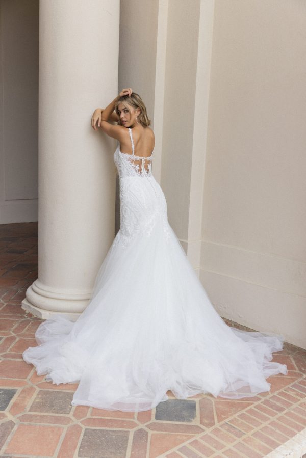 Handcrafted with every designer luxury in mind, Style 7840 brings runway fashion to bridal design. Chic spaghetti straps connect to a soft V-neckline in a flattering fitted bodice that is available with a lining for a modest bridal look or unlined for a sheer alternative. The embellished graphic lace throughout this fit-and-flare silhouette accentuates every curve, and forms a stunning illusion open back detail. Tightly following the curve of the hips, this gorgeous gown trumpets just above the knee into a weightless pedestal of tulle to complete this sexy wedding dress. This gown is also available in plus sizes.