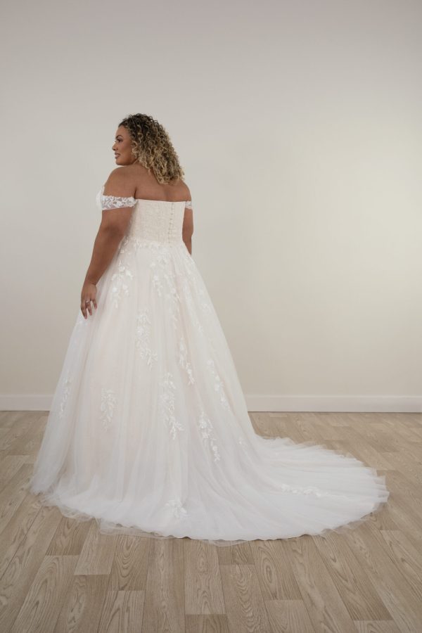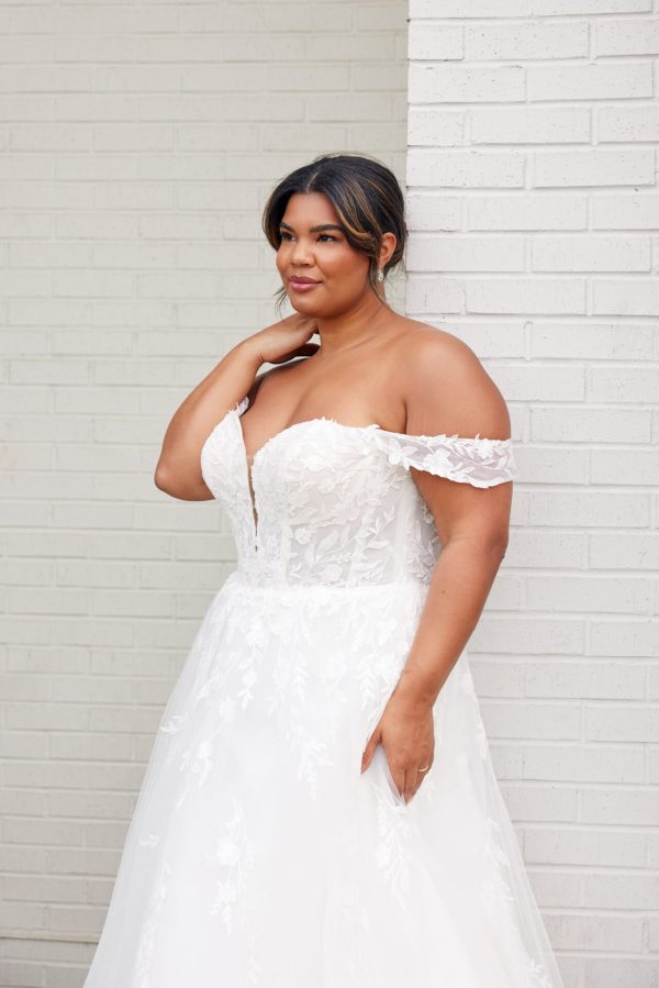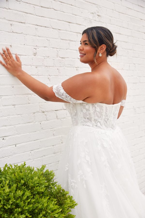 This dreamy plus size off-the-shoulder lace wedding dress artfully blends timeless romance with fashion-forward design. Style 7849 features romantic off-the-shoulder detachable straps in an ethereal leafy lace floral to match the fitted corset-style bodice with a daring plunging sweetheart neckline. Brides can choose between a lined or sheer lace bodice for customizable appeal. Embellished florals trail past the waist into delicate vines before scattering across the frothy A-line skirt in shimmering layers of glitter tulle. Both charming and refined, this sweetheart off-the-shoulder wedding gown is an absolute vision down the aisle.