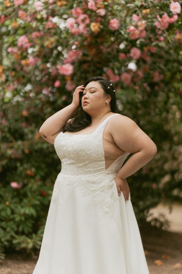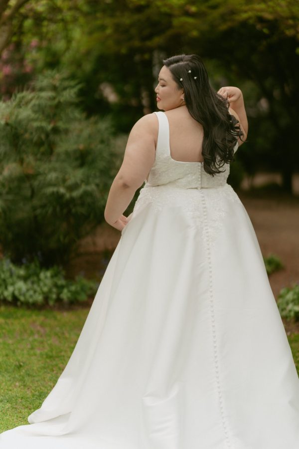 Chic Mikado and embellished floral lace accents adorn the stunning A-line silhouette of Style 7897. Elegant shoulder straps join the modern square neckline of the impeccably tailored bodice as on-trend side cutouts offer a touch of appeal to this classic plus size bridal look. Clean lines frame the back bodice, opening to the mid-back and meeting a row of fabric-covered buttons that trail down the length of the gown. The shimmering sequin-embellished lace accents of the bodice trail just past the waistline, resolving at the demure side pockets and leaving the lustrous Mikado A-line silhouette to make a regal statement down the aisle.