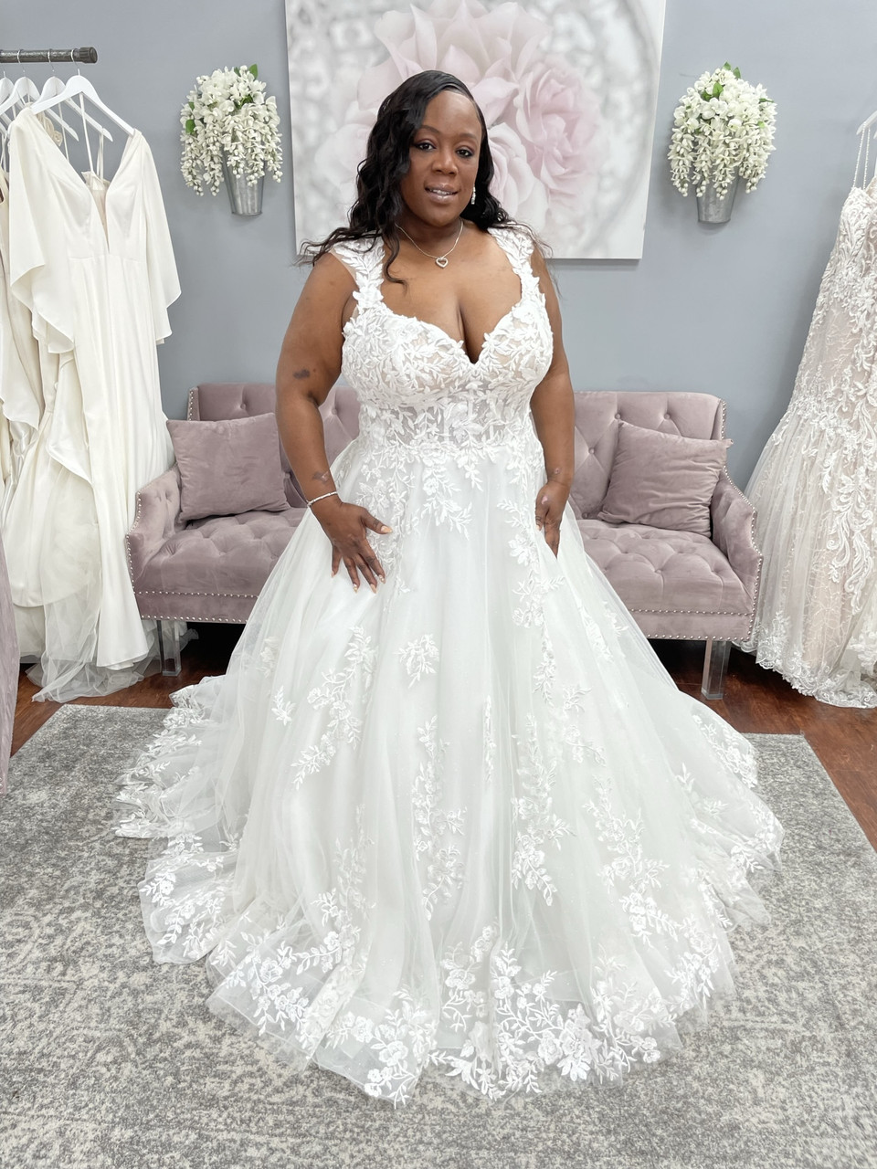 We carry select styles from each designer, and dresses often sell off the floor so availability changes regularly from what’s online.