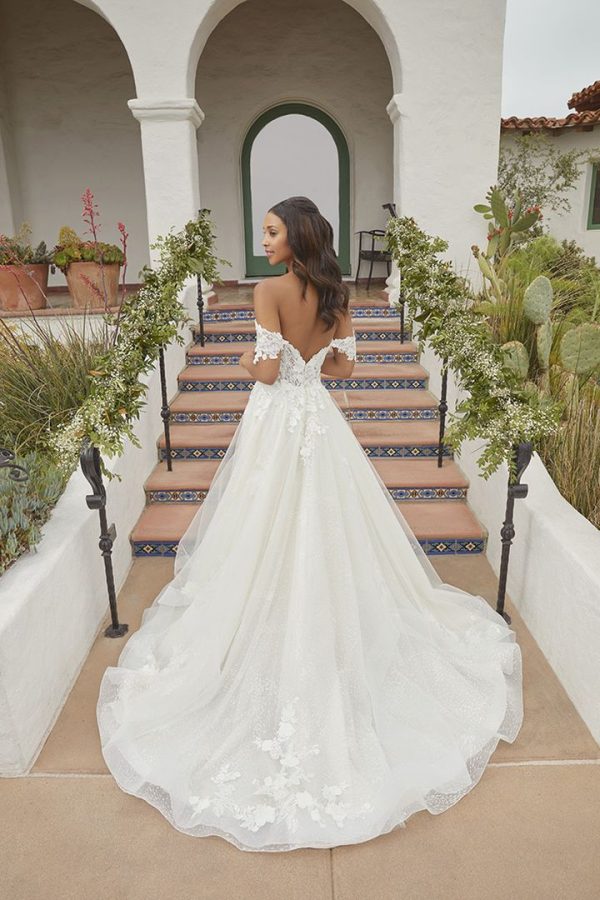 Flirtatiously feminine BL372 Astley is made specially for the whimsical glam bride. The sweetheart neckline on this modern style provides support and structure, complemented by off-shoulder sleeves that can be removed to create a strapless look. The lace bodice is dotted with detailed tulle and beaded floral lace appliques that bloom down toward the bottom of the design. An A-line silhouette is flattering on every body shape and size, emphasized by the gorgeous layered skirt made up of dotted sparkle tulle and horsehair trim, for the most shimmery twirl. Tie the look together with a matching fingertip veil and walk down the aisle in style.