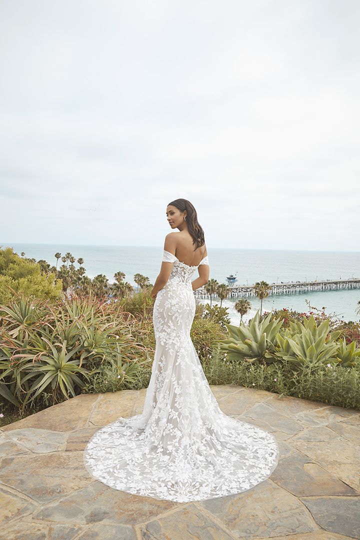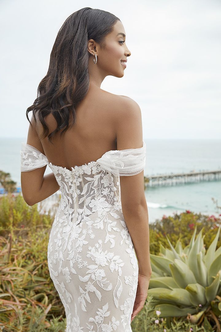 BL378 Nola encapsulates beauty and grace with effortless style. Specially designed to flatter every shape and size, this gown offers the option for three looks in one. Nola can be worn as a fit-and-flare or can easily be transformed into an A-line gown with the removable tulle skirt, extending the train from 54 inches to a beautiful 70. Take off the removable off-shoulder sleeves for your third strapless look from ceremony to reception. Stretch chiffon underneath is irresistibly comfortable, creating a backdrop for the dreamy tulle and detailed sequined floral lace appliques that dance throughout the entire design. To tie the look together, a matching, layered veil is available.