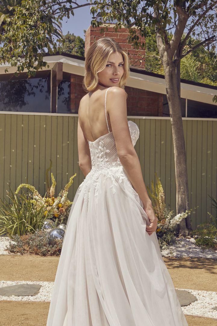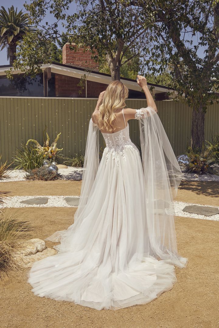 A vision of romance, Style BL396 Breeze by Beloved exudes ethereal elegance. Exquisitely detailed lace appliques and beading decorate the structured bodice, complete with a sweetheart neckline and delicately beaded spaghetti straps. This dreamy wedding dress features an A-line silhouette with stretch lining for comfort, with tulle that flows flawlessly into a 70″ train. A matching fingertip veil & sleeves & choker, sold separately, is a timeless addition. Breathtaking on all figures, Breeze is also available in our curvy sample.