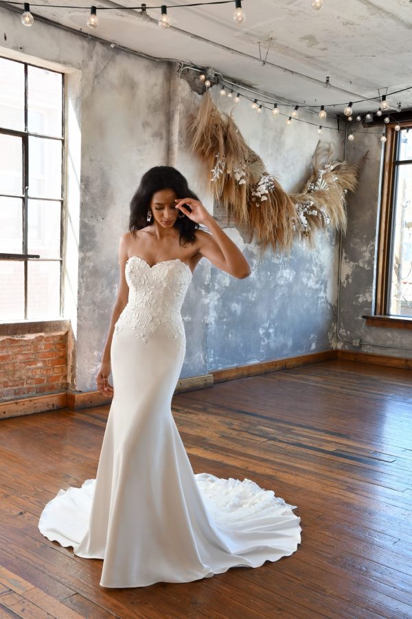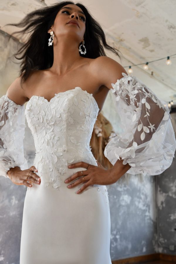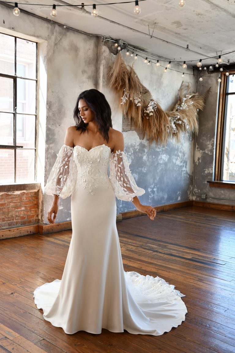 Bohemian glamour meets garden goddess in the Briar gown from All Who Wander. The flattering sweetheart neckline and subtle seaming give the gorgeous wedding dress an ultra-feminine silhouette, while the detachable, off-the-shoulder puff sleeves with 3D lace and floral detailing add fun, free-spirited flair to the design. The sheer bodice with exposed boning and delicate buttons down the back lead to a curve-hugging skirt that creates frothy movement with every step. The grand finale is the fabulous floating train, which features elegant tulle accents and lovely lace detailing.