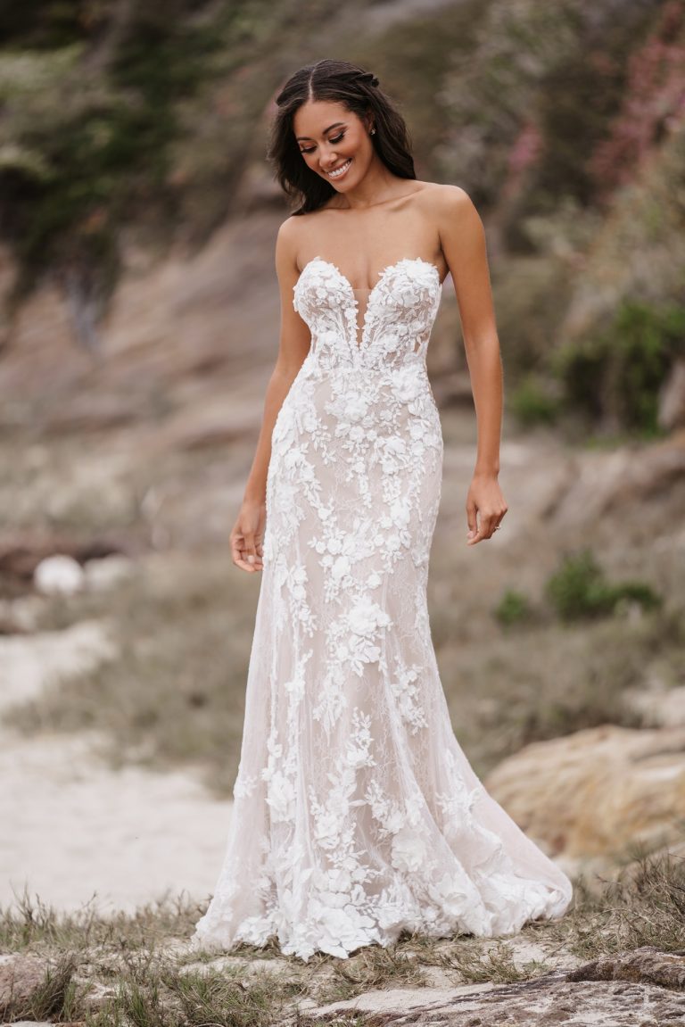 Ethereal texture reigns in this strapless sheath gown, with subtle dimension in the scattered appliques.