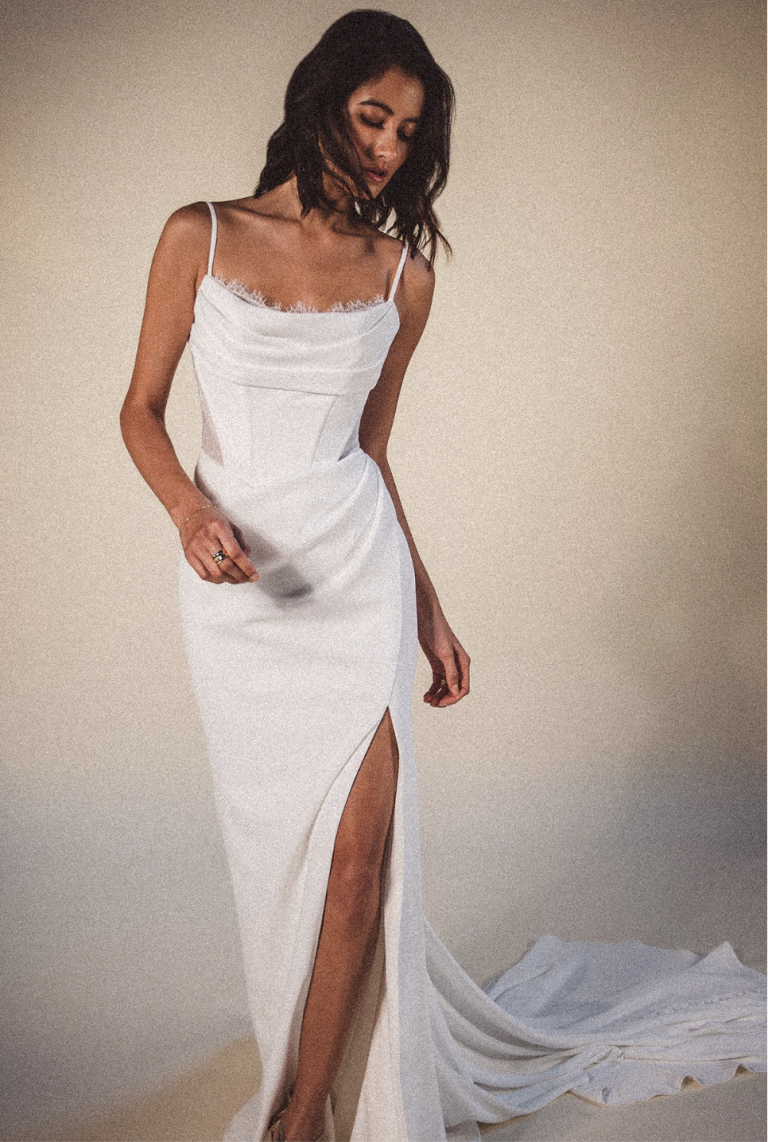 We carry select styles from each designer, and dresses often sell off the floor so availability changes regularly from what’s online.