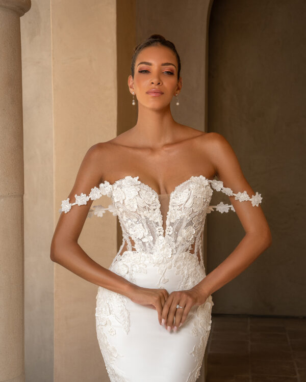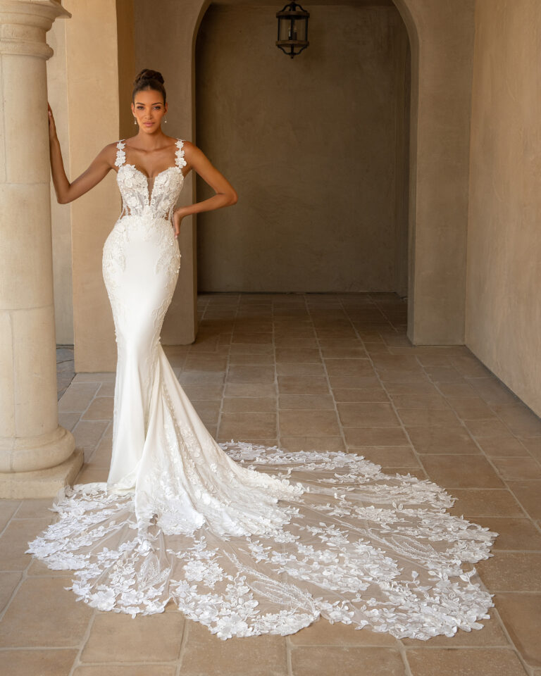 We carry select styles from each designer, and dresses often sell off the floor so availability changes regularly from what’s online.