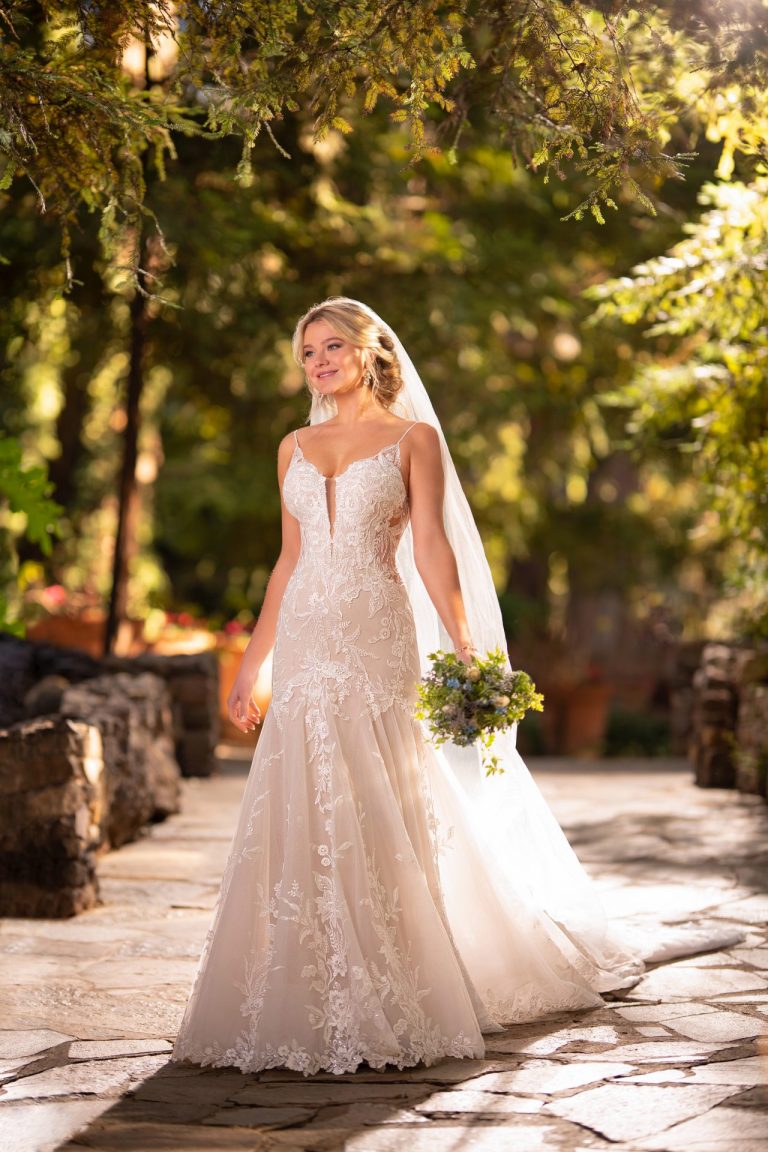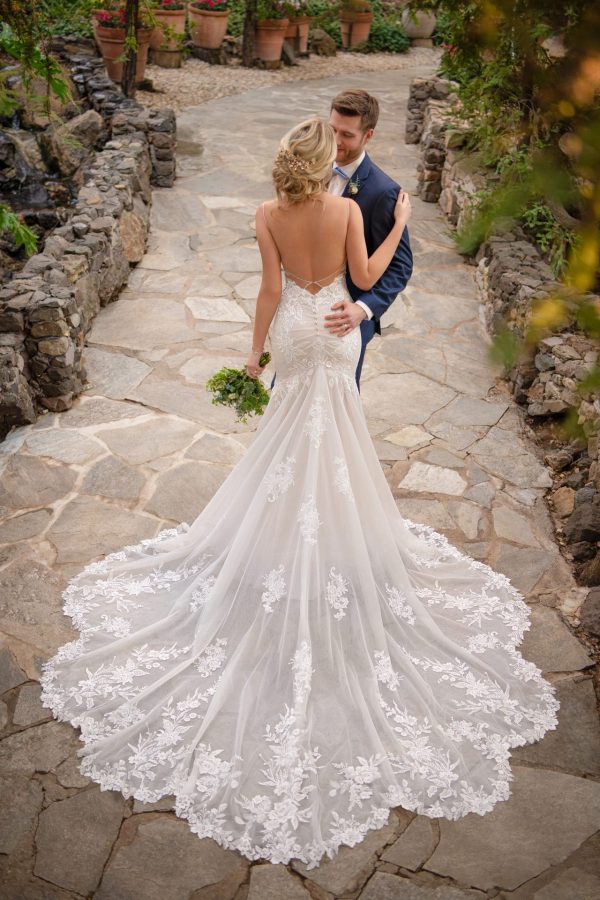This sexy, organic-inspired dream of a dress will be the talk of your wedding day. This delicate mermaid silhouette is pure magic, with seaming through the low hip and a gentle yet voluminous skirt that flares into a breathtaking shaped train. Beaded shoestring straps extend to the back of the gown, with a low keyhole detail at the base of the open back which provides support and a touch of visual interest. The sparkling bodice and skinny plunge neckline are completely feminine, with sheer sides and strong floral lace patterns featuring vine and leaf-like shaping, effortlessly growing over the silhouette of the dress. The ruched detail at the back of the hip enhances your shape, and complements the multi-layer tulle skirt with a lace hem for a classic finish.