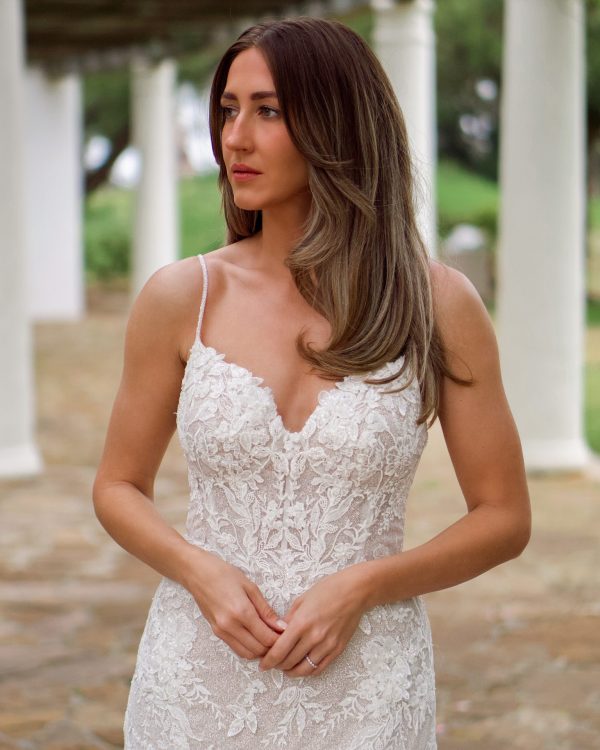 Style D3372 is the ultra-modern wedding gown for the ultra-modern bride. The defined bust cup features contoured seaming, providing expert fit and sexy structure for all-day wearability. Sparkling details from head-to-toe give this gown a show-stopping shimmer, making for a head-turning walk down the aisle. Delicate wide-set spaghetti straps are so sweet and simple, adding elegant support to this decadent gown. Three-dimensional floral details layer over the embroidered lace patterns for a beautifully textured, faintly fluttering effect. Scalloped edges along the train are a nod to classic bridal fashion, elevated for the modern bride with striking floral motifs and sparkling sequin details