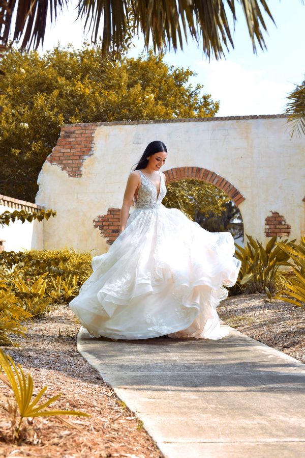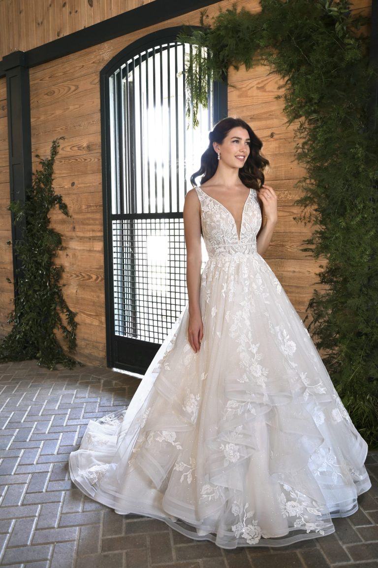 Head-to-toe bridal glamour comes to life in Style D3384. With vintage-inspired lace details throughout and a voluminous, fabulous skirt, this wedding dress is the elevated ballgown for the modern bride. The bodice is adorned in a stunning embroidered lace pattern, with a plunging V-neckline and open back adding a touch of sexiness. Delicate, subtly sparkling beading decorates the border of the neckline and double waistband. Layers upon layers of tulle give the skirt show-stopping volume, with large-scale floral motifs and shimmering embroidered cascading down the skirt for a cohesive, ultra-romantic look.