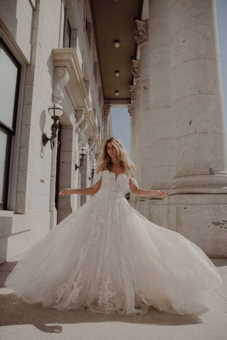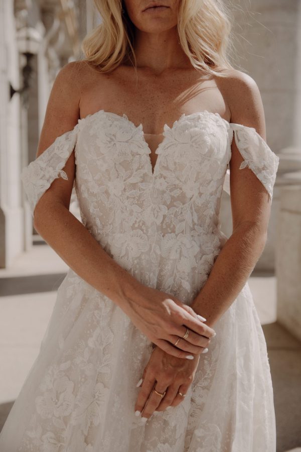 For a bridal look as elegant as it is charming, Style D3414 is the ultimate wedding dress. At the bodice, a sweetheart neckline pairs with vintage-inspired lace patterns for a sophisticated, sweet look. The lace pattern comes alive with all the darling details, from sparkling beading to shimmering sequins. The detachable off-the-shoulder sleeves add an extra sweet touch, with the continued floral lace and beaded details creating a cohesive look. The frothy, flowing skirt is complete with floral lace appliques, adding a glamorous glimmer with every movement. Make your walk down the aisle as sweet as your love story with this gown. This gown is also available in plus sizes.
