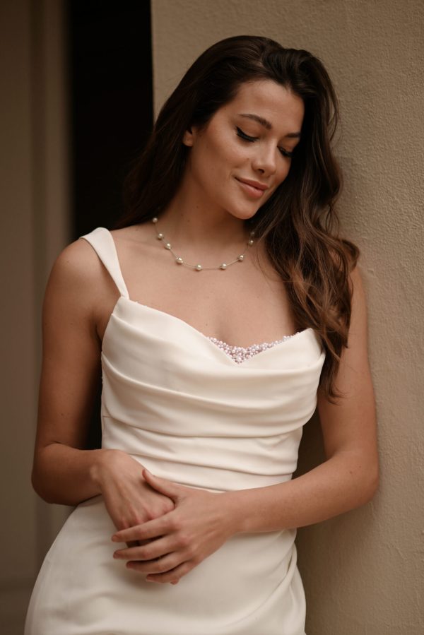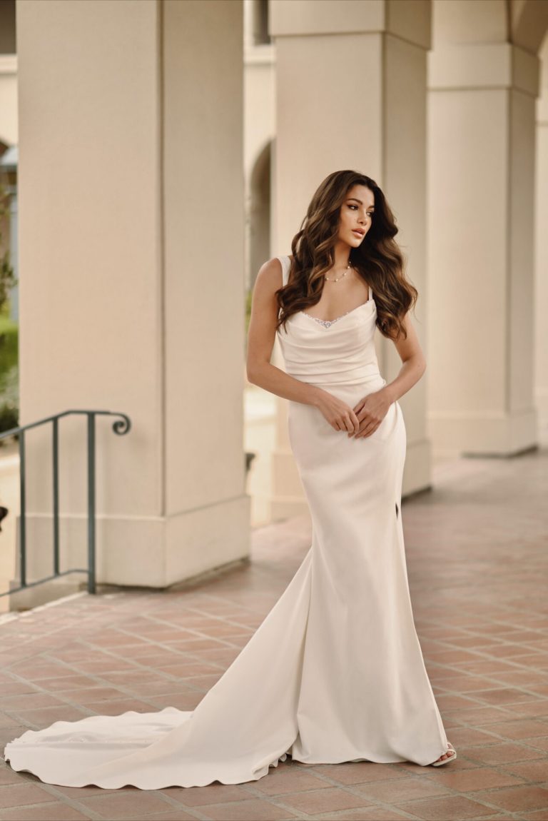 Clean and modern with a touch of sparkle, Style D3823 features wideset shoulder straps and a draped scoop neckline with an alluring hint of pearl beaded accents. More shimmering pearls embellish the low open back detail that concludes with a fitted ruched hip to highlight the natural curves of this column sheath silhouette. In luxurious crepe satin, this chic designer bridal look concludes with a soft sweeping train for an elegant and glamorous finish.