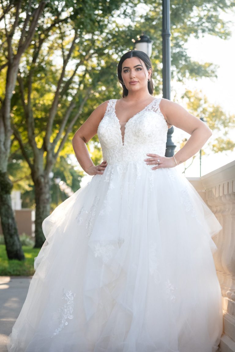 Be enchanted by the stunning combination of sparkling beaded lace and tulle in Style D3892. Sheer short sleeves join a graphic lace bodice with a deep plunging V-neckline embellished with intricate silver or ivory beading. A soft V-back detail and small row of fabric-covered buttons add a timeless and vintage feel as layers of frothy glitter tulle cascade from the waistline to form a voluminous lace-embellished ballgown skirt. Sophisticated and elegant, this plus size princess wedding dress was made for that happily ever after. This wedding gown is also available in long sleeve.