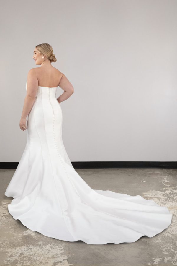 The exquisite Style D3991 is constructed in lustrous Mikado to form a luxe fit-and-flare plus size mermaid wedding gown for the modern bride. A strapless, plunging V-neckline bodice accentuates the natural curves as brilliant contour seam work outlines the figure and paints a gorgeous pedestal for the modern bride. Lining the center of the back from the bodice to the edge of the train, a long row of pearl buttons trails the center back, adding a timeless touch to this contemporary bridal gown. Modern, sexy and refined, this strapless mermaid wedding dress is sure to enchant down the aisle.