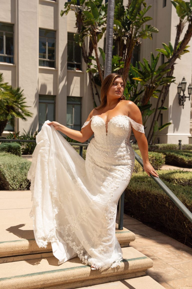 Elegant and romantic, Style D3992+ is a sexy fit-and-flare plus size wedding gown with brilliant and unique embellishments. From a strapless plunging sweetheart neckline, detachable lace and tulle off-the-shoulder straps grace the upper arm, adding a soft and alluring detail to the fitted bodice. Impeccably tailored through the torso, the gorgeous lace gown wraps around the figure into a sheer corset back with 3D floral accents and a subtle row of fabric-covered buttons down the spine. Delicately painted in scattered leafy lace appliqués and 3D floral accents, the fit-and-flare silhouette hugs the hips and flares into a soft, sweeping skirt and shaped train edged in the same brilliant lace motifs.