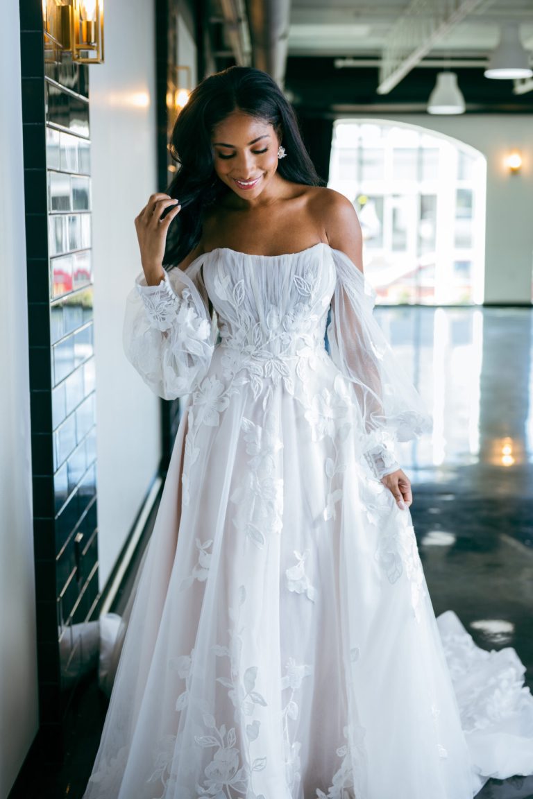 Bringing modern elegance to life, Style D4029 radiates pure bridal bliss in this allover lace A-line wedding gown. Sheer detachable off-the-shoulder blouson sleeves attach to a strapless bodice featuring a flattering scoop neckline. An oversized embroidered lace embellishes the graceful A-line silhouette throughout, resolving at the lace-accented sweeping train. Offering versatility and style, this romantic wedding gown comes in lined and unlined options for varied levels of sheerness, and the detachable sleeves offer a versatile wedding day look. A breathtaking vision down the aisle, this elegant lace gown was made for a lifetime of romantic daydreams. This gown is available in plus sizes.