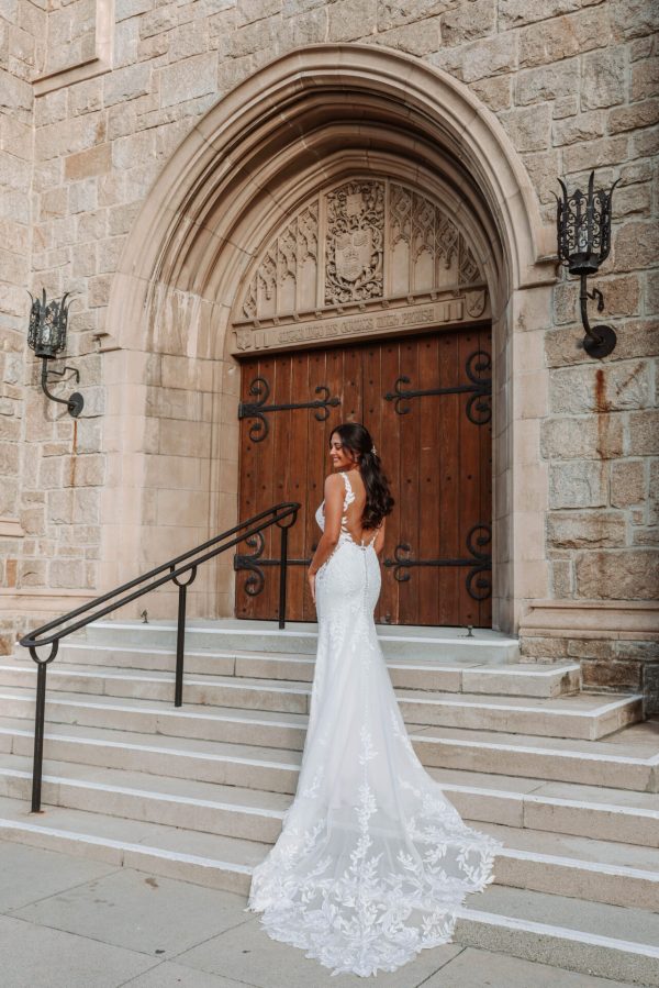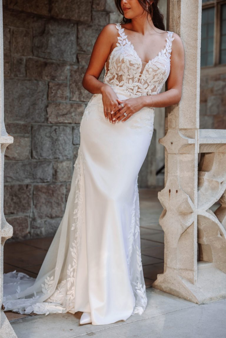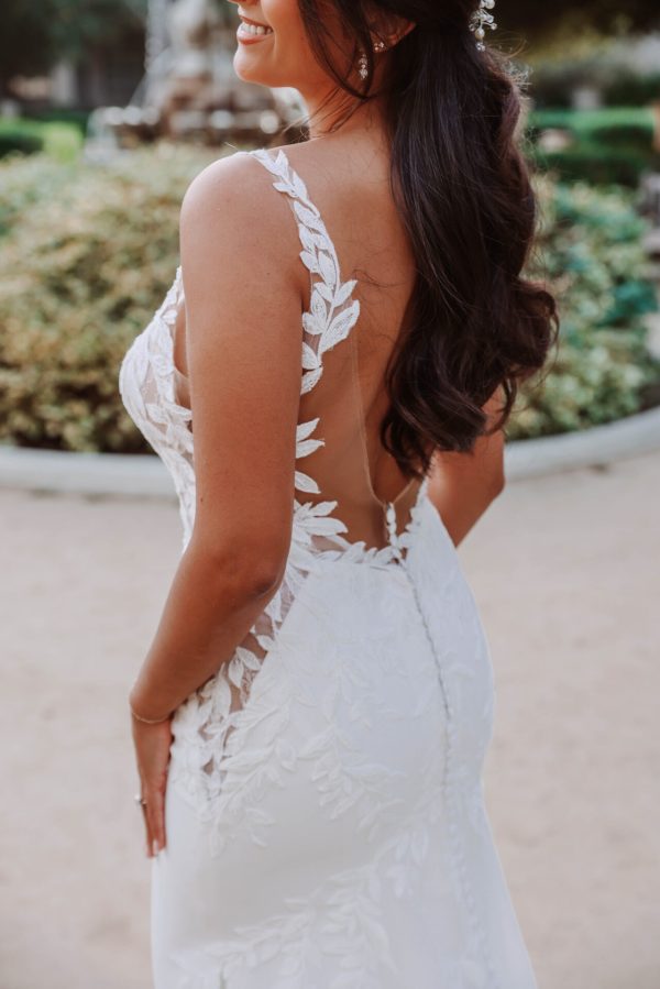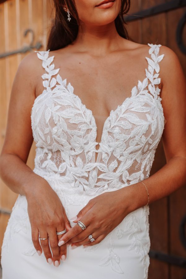 As if painted in graceful leafy vines of lace, Style D4037 artfully blends sexy bridal style with classic romance. The flattering column sheath silhouette begins with leafy shoulder straps that extend from the sexy plunging V-neckline of the sheer bodice. Alluring side cutouts open to the hip, culminating in a dramatic low scooped back detail. Crepe fabric hugs the hips before trailing into a romantic shaped lace train speckled with botanical lace accents. Clean yet oh-so-chic, this sexy wedding gown embodies effortless sensuality made for the modern romantic.
